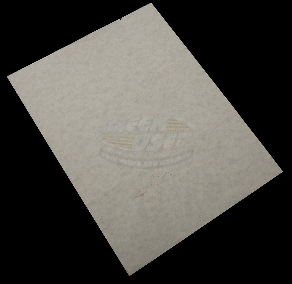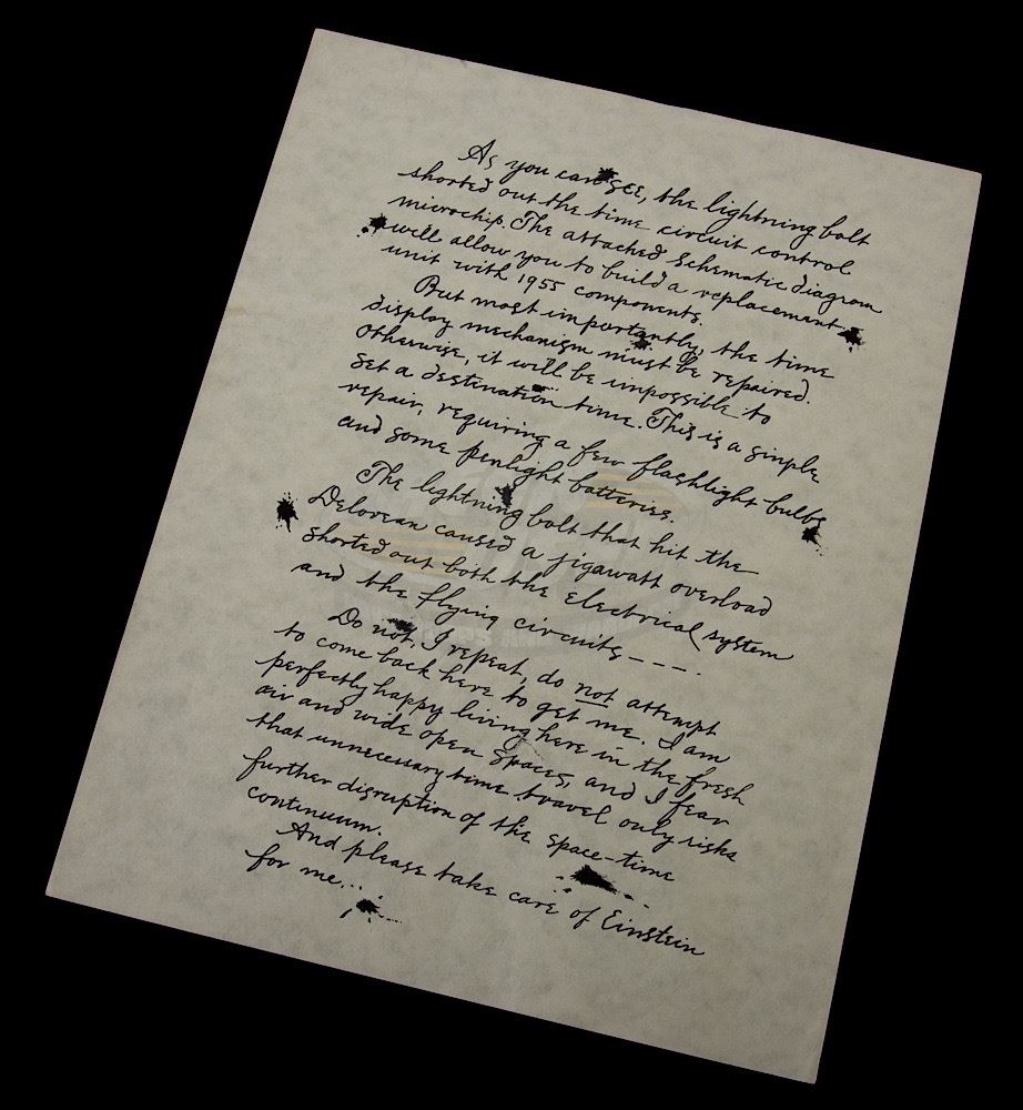 This is an original un-aged production back-up to the repair instructions used on screen by Christopher Lloyd as "Dr. Emmett Brown" and Michael J. Fox as "Marty McFly". The one page repair instruction was sealed inside the DeLorean time machine by Doc in 1885 to help the Doc of 1955 repair the DeLorean and get Marty back to the future. Because this prop was used only for this one scene, very few of these were made for filming. Minor wear from storage is present.