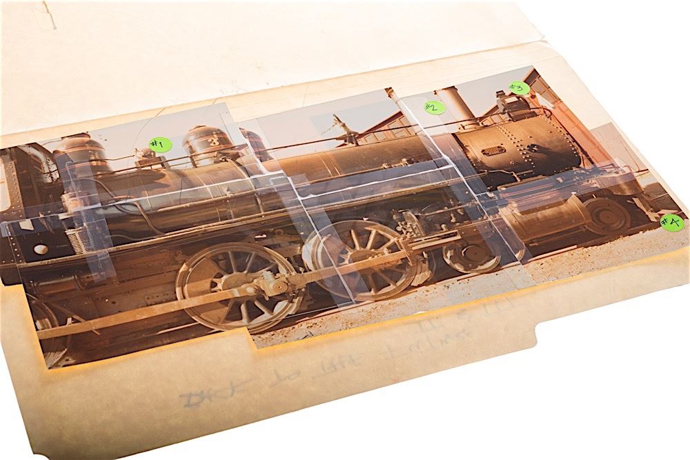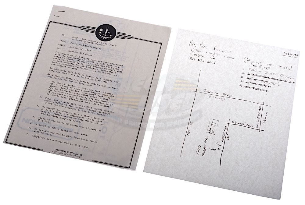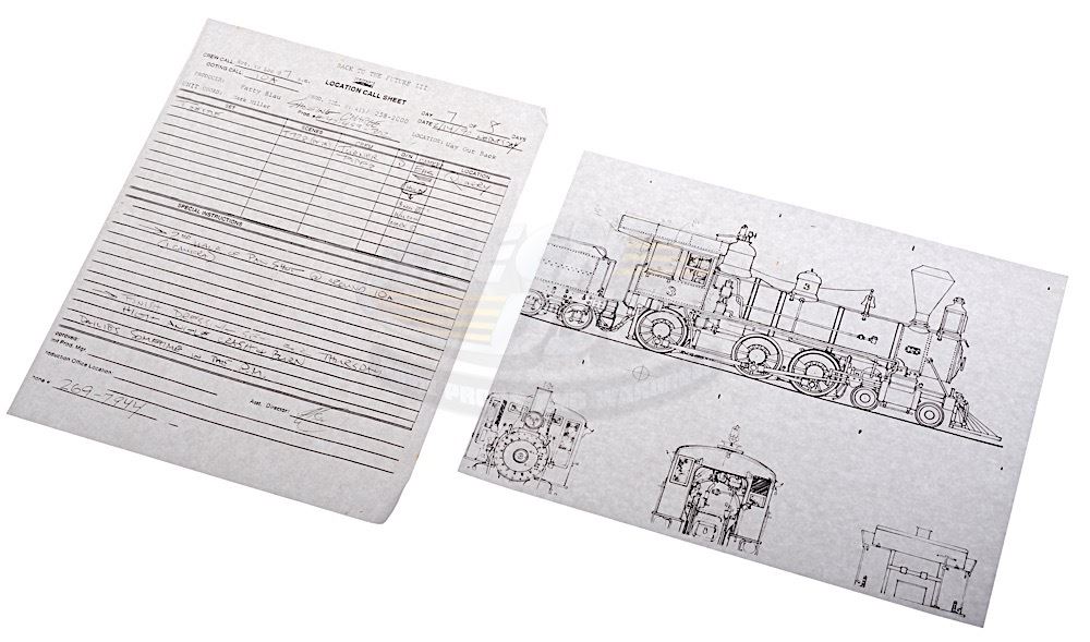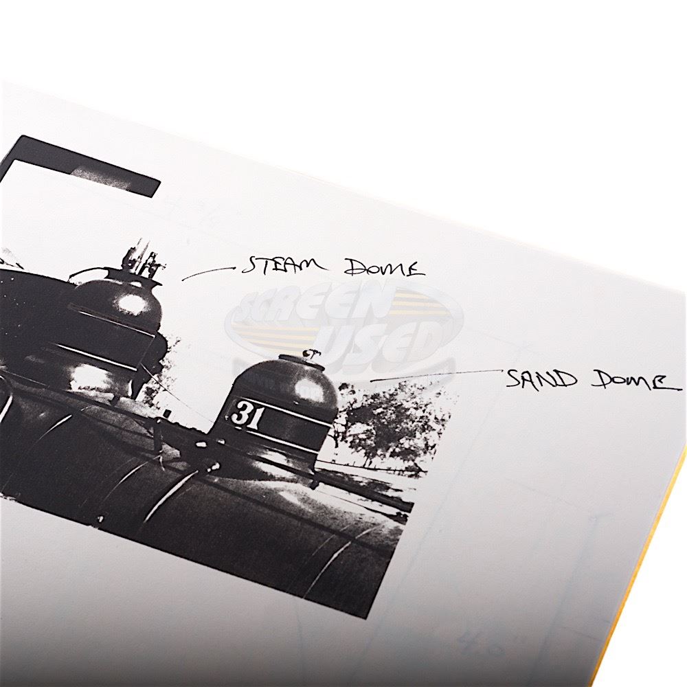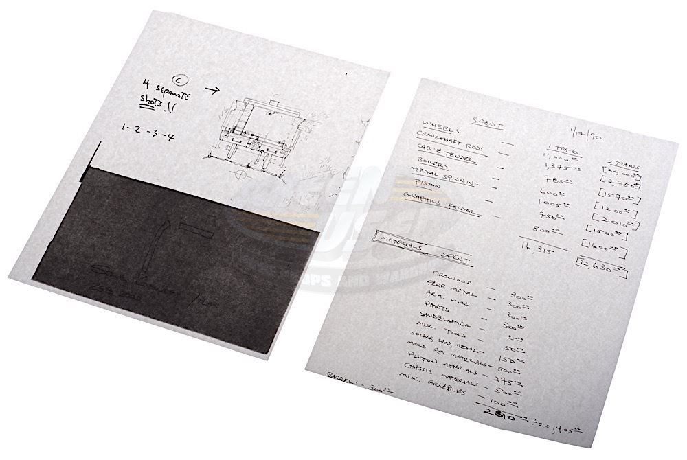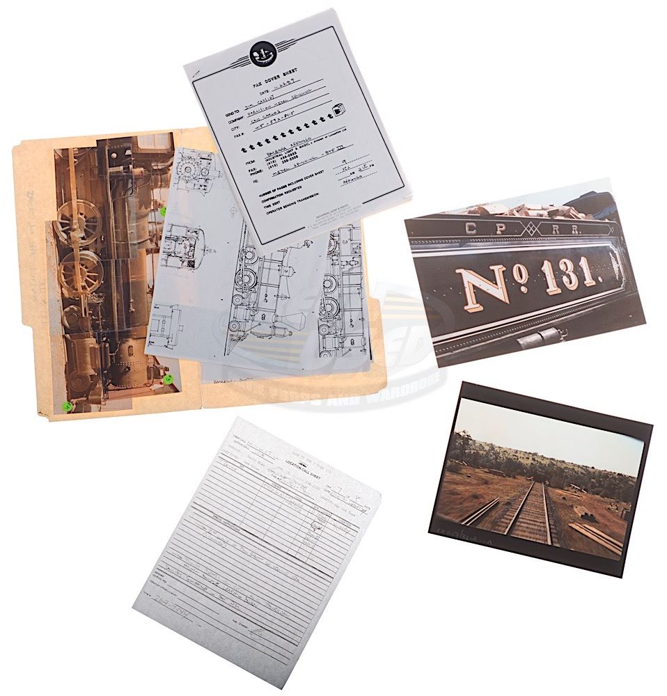 A collection of unpublished original photographs featuring the train and "End of Track" sign. The photographs consist of two loose 8" x 10" and six 4" x 6" photographs taken of the various sections of the train taped together and attached to the inside of the production folder. Included with the photographs are several pages of production paperwork and production used copied train drawings with handwritten notes and measurements. A very rare look into the design and filming details at ILM.