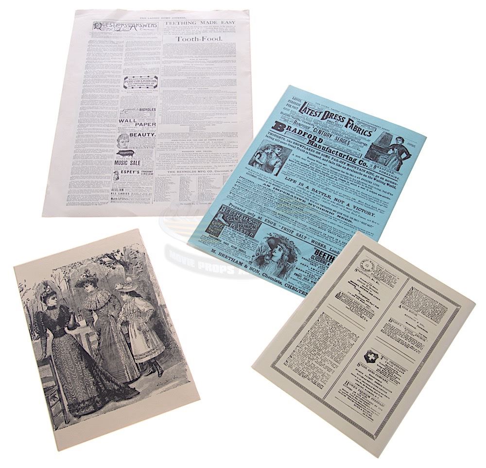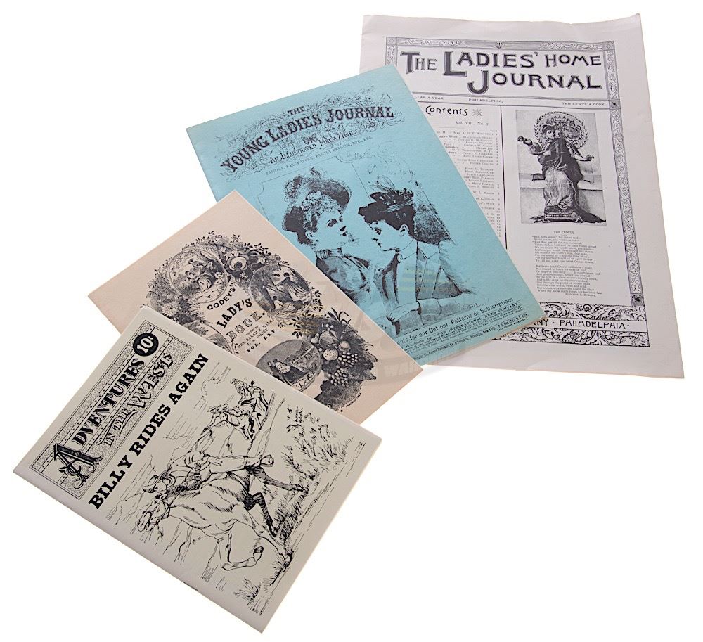(Universal Pictures, 1990) A set of four vintage magazines custom printed by the production for use by various actors during filming and as set dressing. The magazines consist of a "Lady's Book", "Adventures in the West", one "Young Ladies Journal" and one "Ladies' Home Journal". The magazines feature various articles and advertisements and range in size from 9.5" x 7" to 16" x 11.5". Wear from use and storage is present.