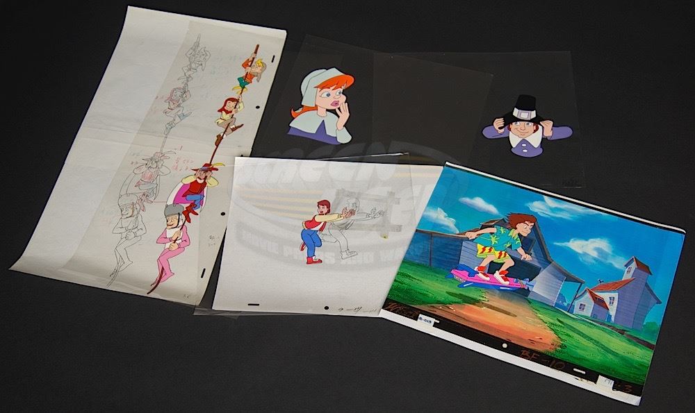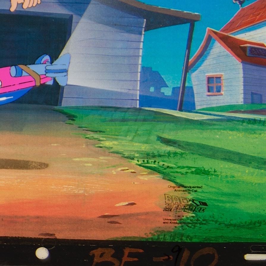 A set of five original hand-painted cels and two original pencil production drawings. Color paint on Mylar and pencil on paper, each measures approximately 12.5" x 10.5". One cel features a color-copied background and official "Back to the Future-Original Production Cel" sticker applied.