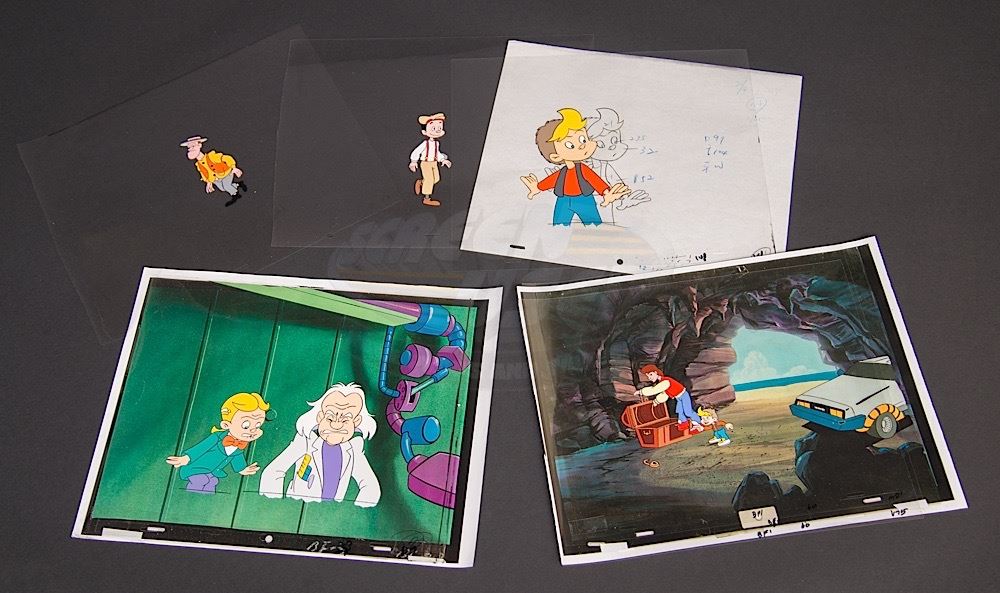A set of five original hand-painted cels and one original pencil production drawing. Color paint on Mylar and pencil on paper, each measures approximately 12.5" x 10.5". Two cels feature a color-copied background.