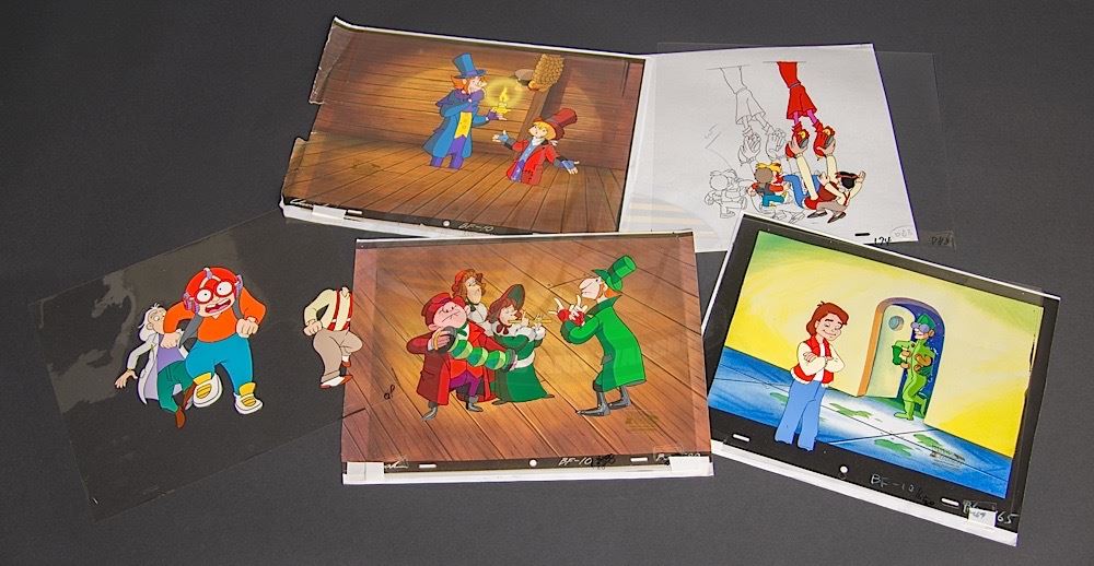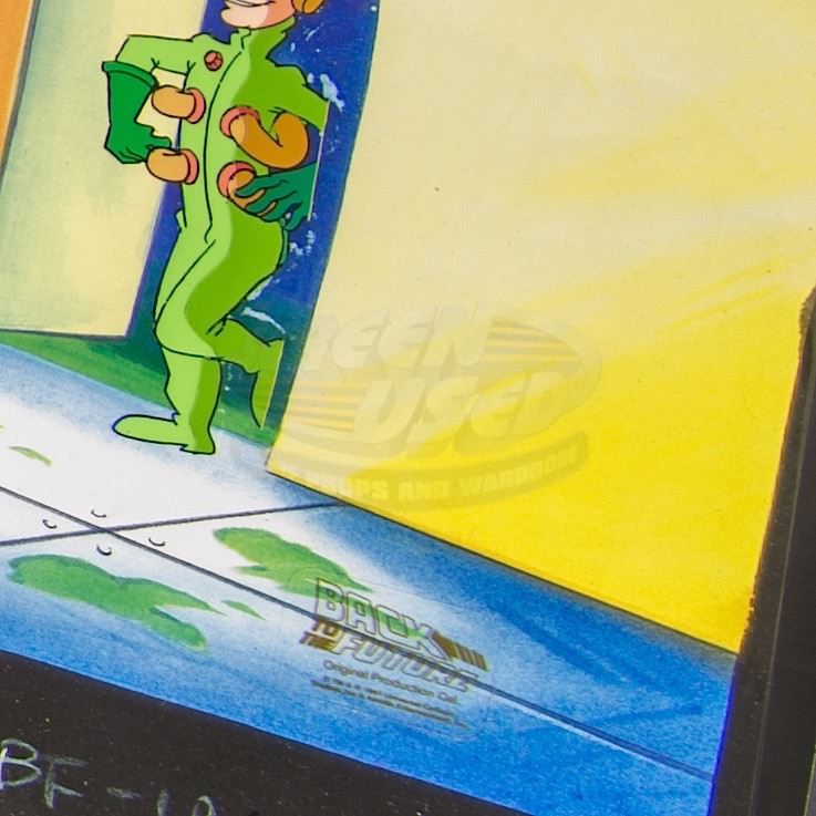 A set of five original hand-painted cels and one original pencil production drawing. Color paint on Mylar and pencil on paper, each measures approximately 12.5" x 10.5". Three cels feature a color-copied background and two cels have the official "Back to the Future-Original Production Cel" sticker applied.
