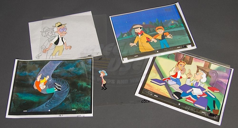 A set of five original hand-painted cels and one original pencil production drawing. Color paint on Mylar and pencil on paper, each measures approximately 12.5" x 10.5". Three cels feature a color-copied background and one cel has the official "Back to the Future-Original Production Cel" sticker applied.