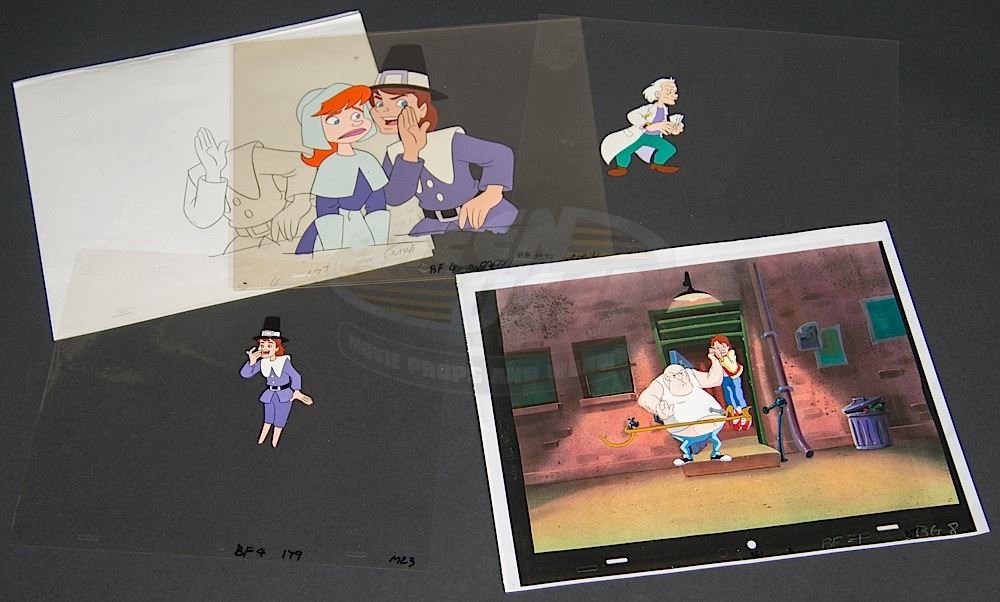 A set of four original hand-painted cels and one original pencil production drawing. Color paint on Mylar and pencil on paper, each measures approximately 12.5" x 10.5". One cel features a color-copied background.