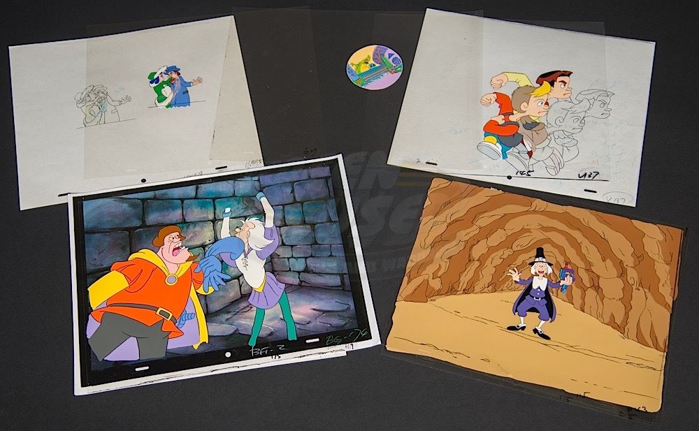A set of five original hand-painted cels and two original pencil production drawings. Color paint on Mylar and pencil on paper, each measures approximately 12.5" x 10.5". One cel features a color-copied background.