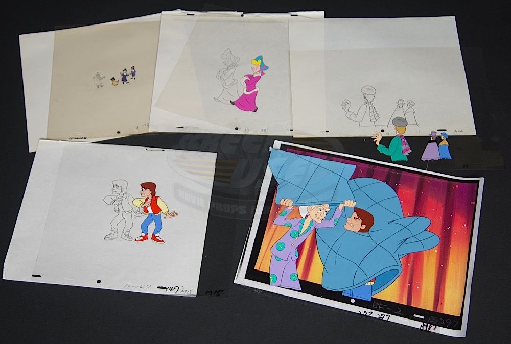 A set of five original hand-painted cels and four original pencil production drawings. Color paint on Mylar and pencil on paper, each measures approximately 12.5" x 10.5". One cel features a color-copied background.