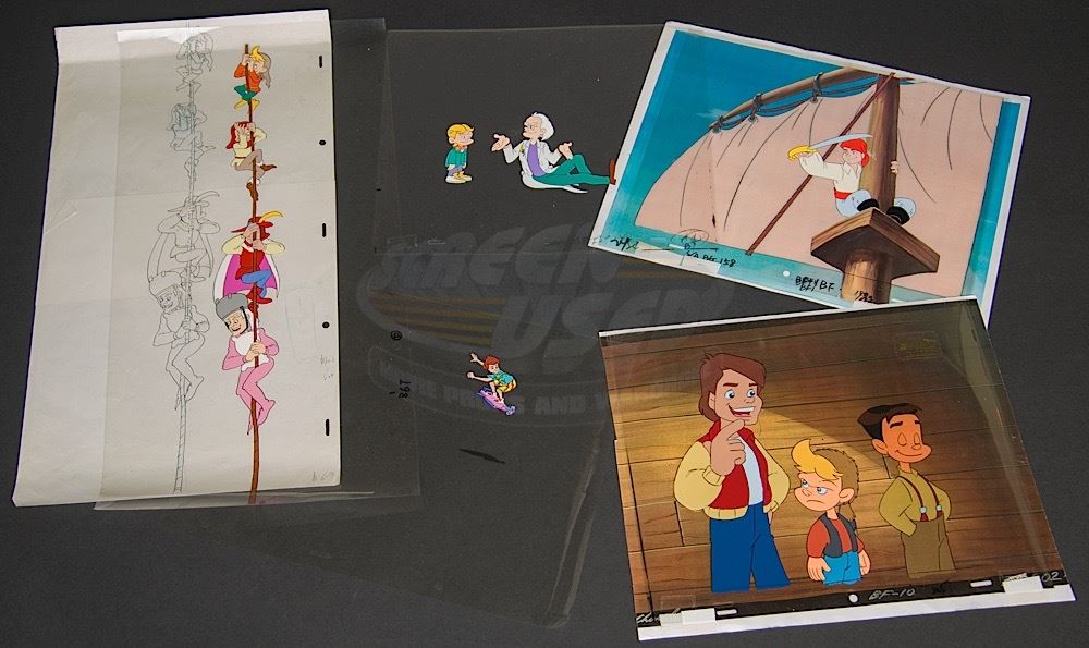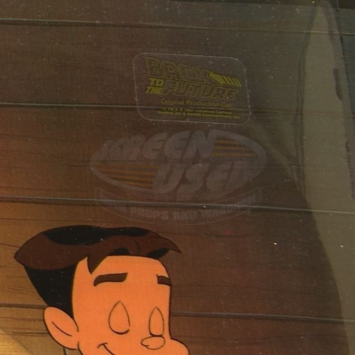 A set of five original hand-painted cels and one original pencil production drawing. Color paint on Mylar and pencil on paper, each measures approximately 12.5" x 10.5". Two cels feature a color-copied background and one cel has the official "Back to the Future-Original Production Cel" sticker applied.