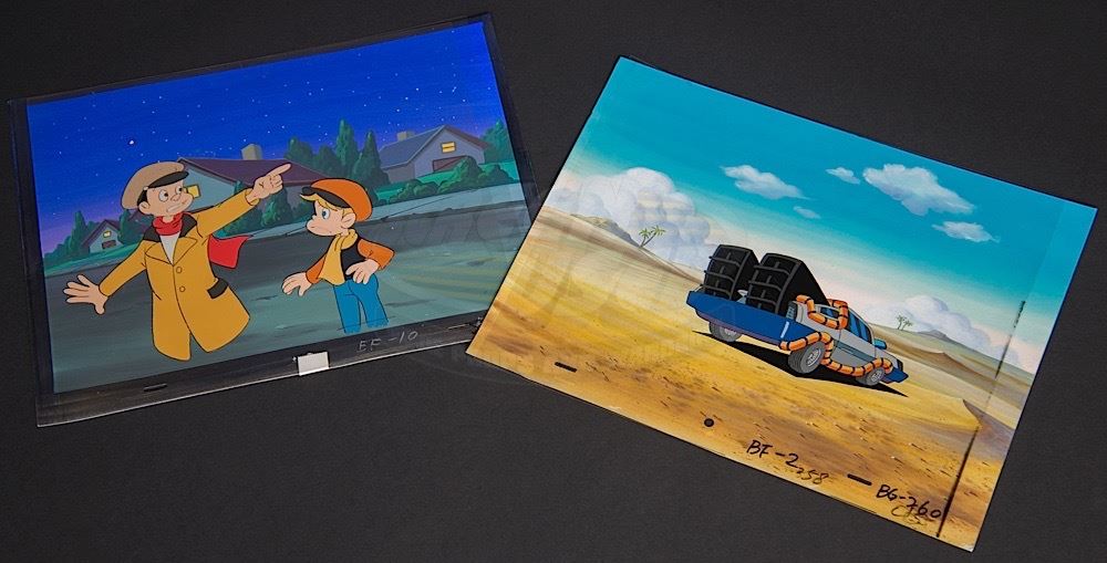 Two original hand painted cels, each with very rare hand painted production used backgrounds. Original hand painted backgrounds are very rare, as only one background is required for each scene, or set of animated actions for the specific camera angle. Each cel measures approximately 12.5" x 10.5" and each background measures approximately 13.75" x 10.5".