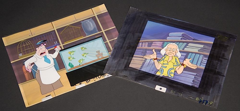 Two original hand painted cels, each with very rare hand painted production used backgrounds. Original hand painted backgrounds are very rare, as only one background is required for each scene, or set of animated actions for the specific camera angle. Each cel measures approximately 12.5" x 10.5" and each background measures approximately 13.75" x 10.5". One cel features an official "Back to the Future-Original Production Cel" sticker applied.