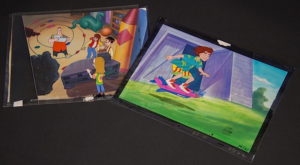 Two original hand painted cels, each with very rare hand painted production used backgrounds. Original hand painted backgrounds are very rare, as only one background is required for each scene, or set of animated actions for the specific camera angle. Each cel measures approximately 12.5" x 10.5" and each background measures approximately 13.75" x 10.5". One cel features an official "Back to the Future-Original Production Cel" sticker applied.