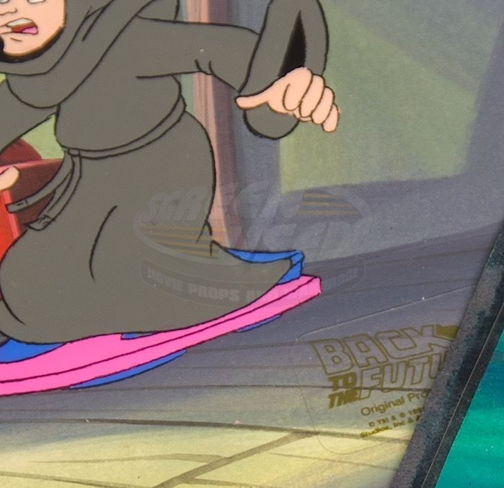 Two original hand painted cels, each with very rare hand painted production used backgrounds. Original hand painted backgrounds are very rare, as only one background is required for each scene, or set of animated actions for the specific camera angle. Each cel measures approximately 12.5" x 10.5" and each background measures approximately 13.75" x 10.5". One cel features an official "Back to the Future-Original Production Cel" sticker applied.