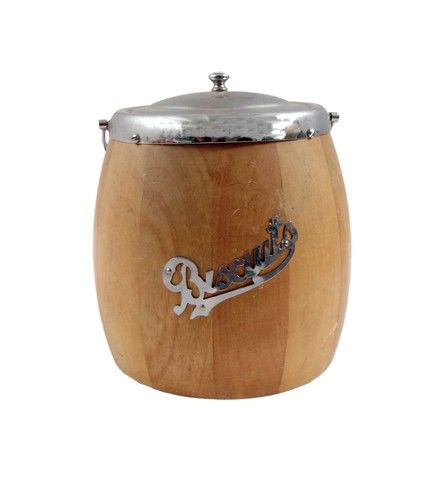 "Back to the Future" (1985) brought back great nostalgia for a more innocent time, especially for all of those who had just gone through the shallow wasteland that was the 1970's! This is a period wood with metal top jar with "Biscuits" (presumably baked by Mom) on the front used as a background prop in the production. (Approx. 7 1/2" tall).
