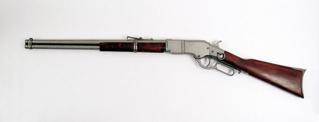 A full production screen used replica of Doc Brown's (Christopher Lloyd) Winchester Model 1866 Rifle from "Back To The Future Part III" (1990). The original that Doc uses to get Mad Dog Tannen's gang to release Marty McFly is gold plated and has his custom built scope. This is a stunt replica (without the gold plating or the scope). Although non-functioning, it is exact in all details with bolt, lever and hammer action, and because it's made of metal and wood is just as heavy as the live fire hero version. "Universal" (for Universal Studios) is etched into the trigger loop. Because of its weight please note there will be an extra shipping charge. Because this is non-functional there is no special license needed to own this rifle. Rifle is 38".
