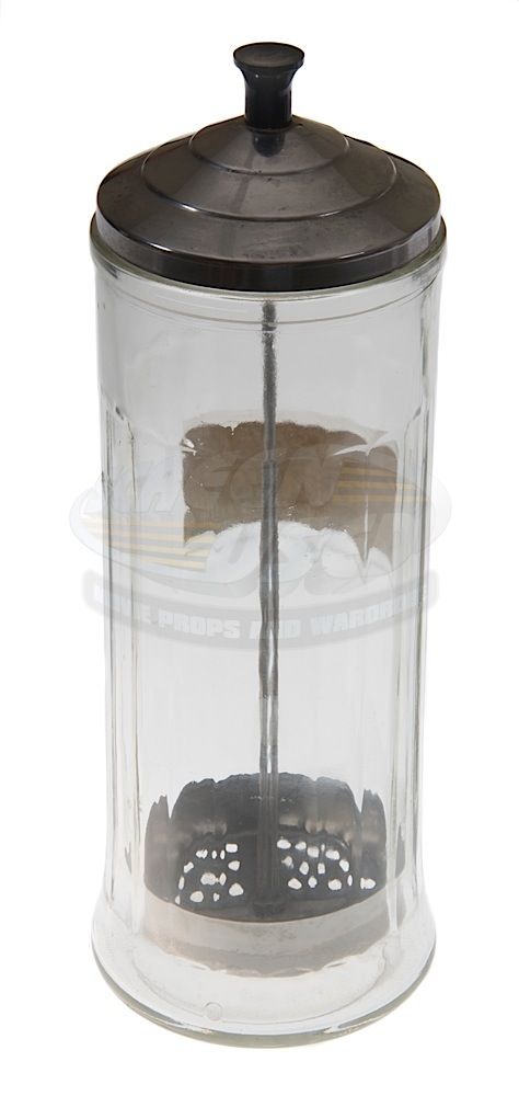 (Universal Pictures, 1985) This vintage straw dispenser was acquired by the production and customized for use as set dressing during filming. The vintage straw dispenser is made of glass with a metal cap and inner tray. The dispenser features a custom-printed "Sunshine Straws" label on one side. This prop can be seen on the counter of Lou's cafe, stands 11" tall and remains in very good condition, and was acquired directly from Assistant Property Master of the film. The ScreenUsed COA on this item is also signed by the Assistant Property Master of the film.