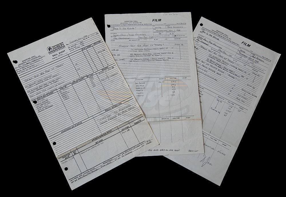A set of three original production used call sheets dated November 1st, 7th and 8th 1984. The two sided pages detail the days production requirements and actor list. These are special call sheets, as they cover the screen tests for the part of Marty, listing actors Ralph Macchio, Eric Stoltz and others that were testing for the role. Each page measures 8.5" x 14".