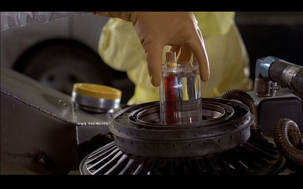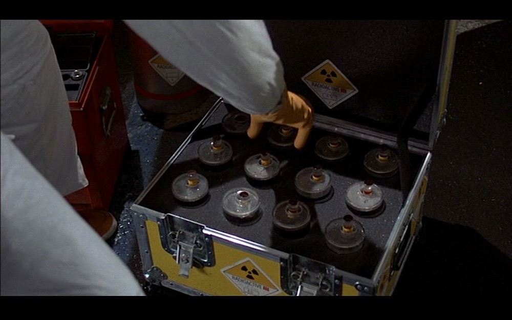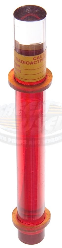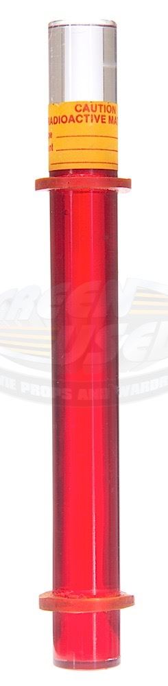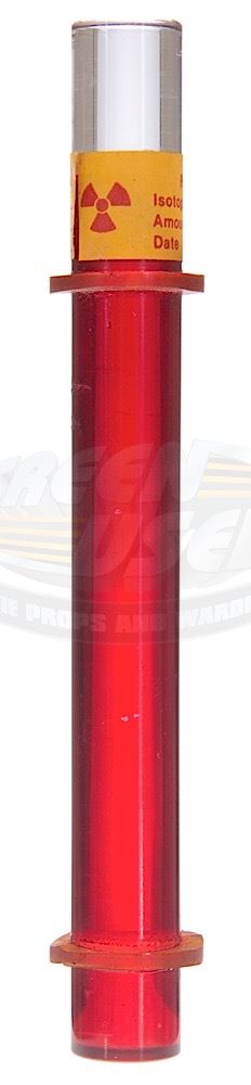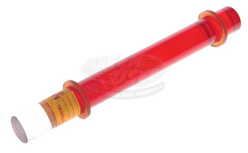 (Universal Pictures, 1985) This prop plutonium rod was custom-made by the production for use by Christopher Lloyd as "Doc Brown". The rod is made of red and clear acrylic with a caution label applied to the top. The prop shows some wear from use and storage, but remains in very good condition. A very rare prop from the first film.
