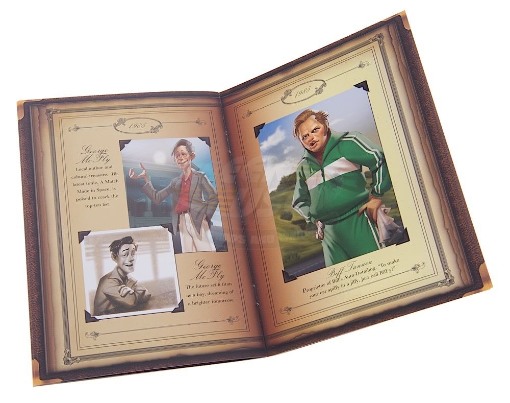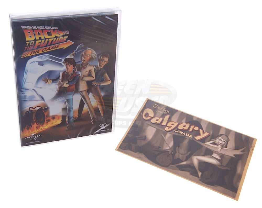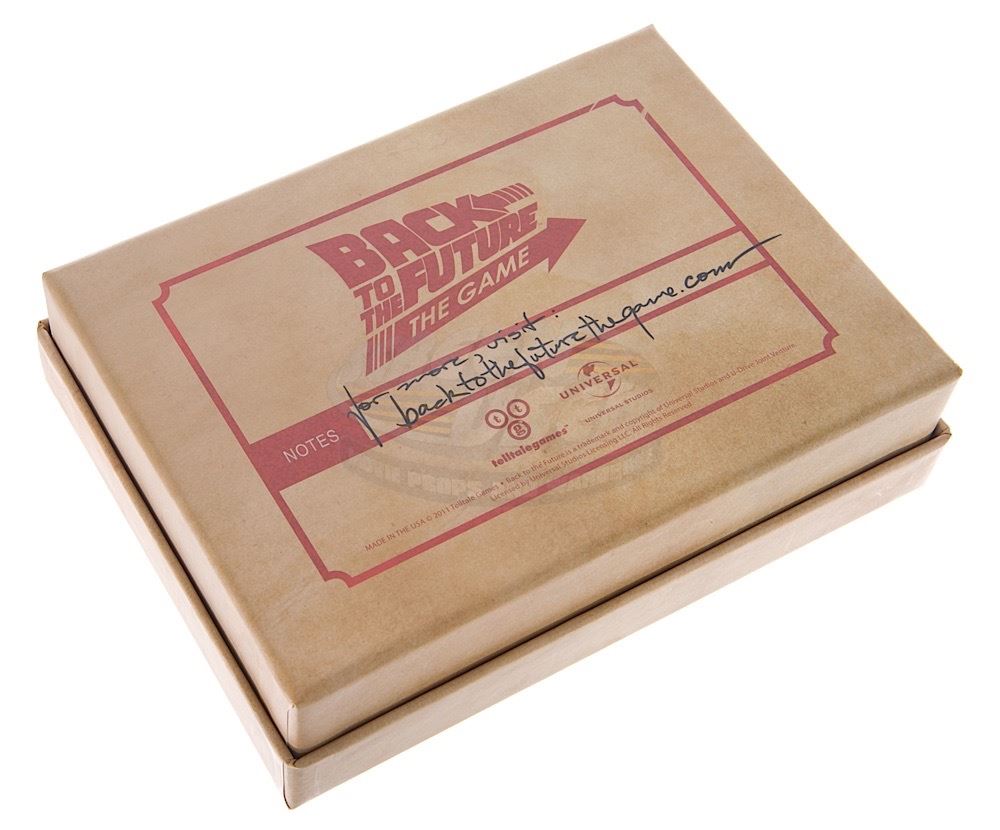 A rare original Back to the Future press kit. The press kit is contained in a special "Hill Valley Historical Society Archives" box and consists of three pages from Doc Brown's scientific journals, an image of Doc's Flux Capacitor drawing, a booklet of character portraits, a postcard and a sealed back to the Future The Game. Box measures 8" x 6" x 2".