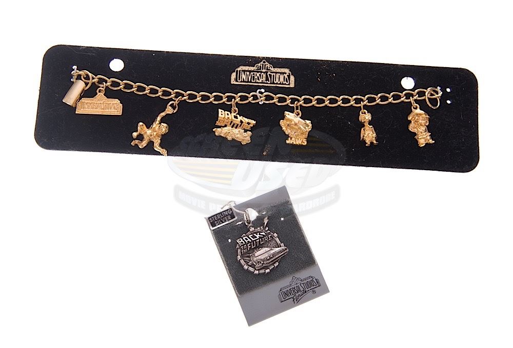 This charm bracelet and charm were sold at Universal Studios gift shops during the run of Back to the Future The Ride and are no longer available. The bracelet features small charms of the various Universal Studios attractions of that time period including Back to the Future. The bracelet measures 6.5" in length. The silver charm features the Back to the Future logo with the iconic DeLorean Time Machine and measures .75" in diameter.