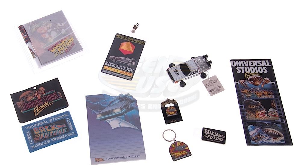 A collection of nine pieces of original vintage Back to the Future the Ride memorabilia consisting of a toy DeLorean Time Machine measuring 4.25" in length, a notepad in its original packaging, a keychain, a pin, a fridge magnet, a laminated "Institute of Future Technology" DeLorean parking permit, a cloth patch in its original packaging measuring 4.5" x 2.75", a pen and notepad set in its original packaging and a Universal Studios Florida guide booklet.
