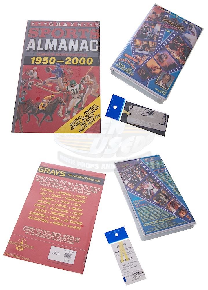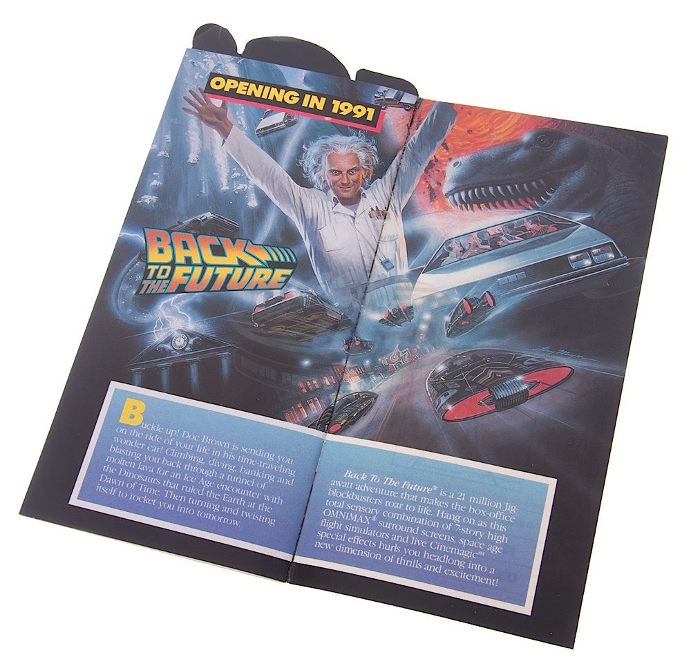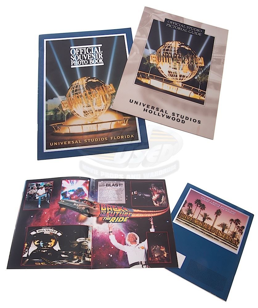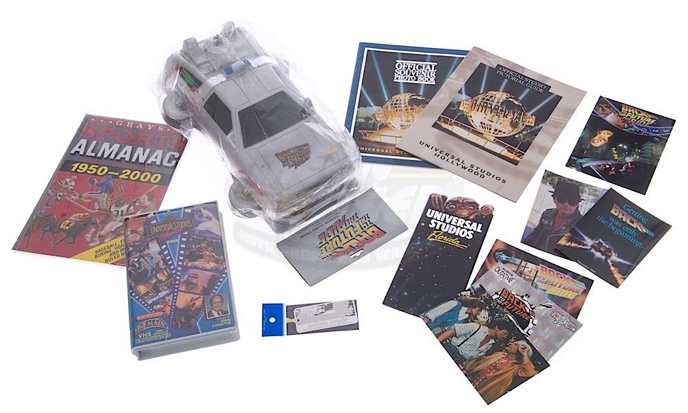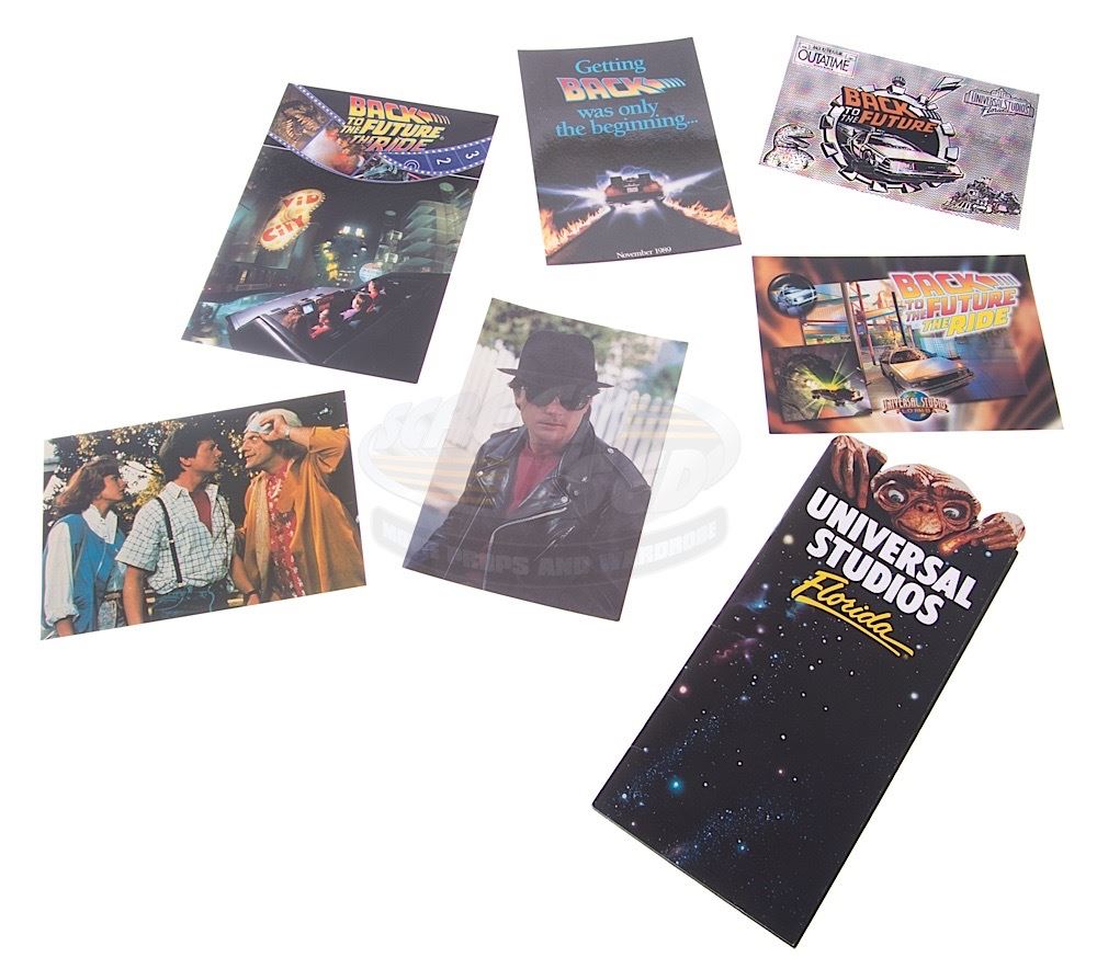 A is a collection of seven pieces of original vintage Back to the Future the Ride memorabilia consisting of a plastic DeLorean Time Machine hat in its original packaging, a sports Almanac notebook, a Universal Studios Hollywood VHS tape, a bookmarker in it's original packaging, a Universal Studios Hollywood pictorial guide booklet, a Universal Studios Florida souvenir photo book, six postcards and a Universal Studios Florida guide booklet.