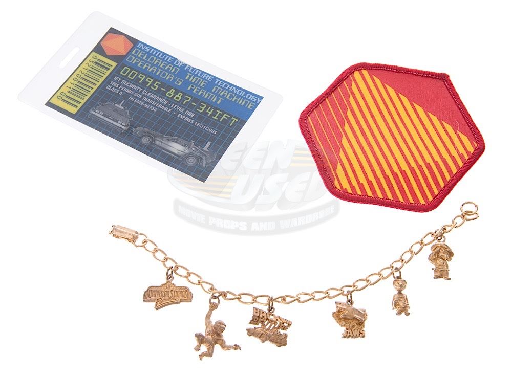 A collection of ten pieces of original vintage Back to the Future the Ride memorabilia consisting of a notepad, pen & DeLorean Time Machine toy in it's original packaging, a plastic DeLorean Time Machine & Universal Studios globe logo figurine, a small DeLorean Time Machine toy and a small DeLorean Time Machine toy in it's original packaging from Universal Studios Japan, an unused matchbook, an Institute of Future Technology patch, a DeLorean Time Machine operator's permit, a fridge magnet and a charm bracelet.