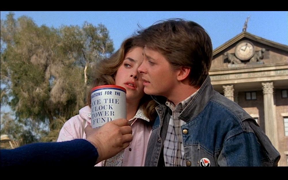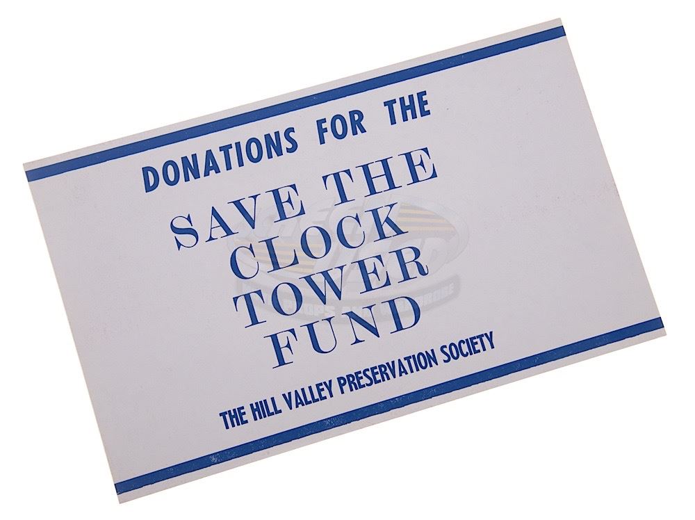 This prop "Save The Clock Tower" can label was custom-printed by the production for use by various actors and as set dressing and is an unused back-up. The label features the blue lettering "Donations for the, Save The Clock Tower Fund, The Hill Valley Preservation Society". Measures 8.5" x 5".