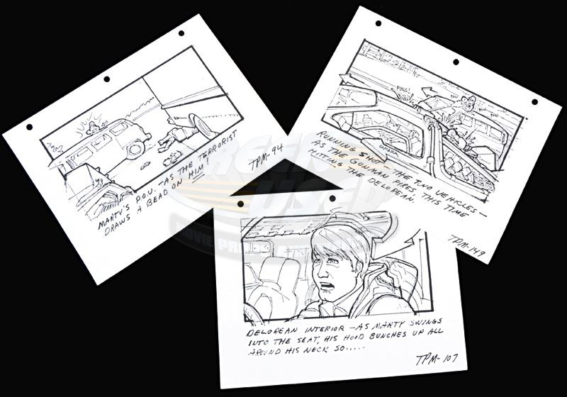 (Universal, 1985) This is a set of three production used storyboards for the "Twin Pines/Lone Pine Mall" scenes. These storyboards detail the shot requirements of the scene. These were used by Kevin Pike and his team during the production. The pages have minor wear consistent with use, but remain in good condition.