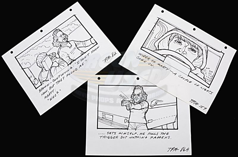 (Universal, 1985) This is a set of three production used storyboards for the "Twin Pines/Lone Pine Mall" scenes. These storyboards detail the shot requirements of the scene. These were used by Kevin Pike and his team during the production. The pages have minor wear consistent with use, but remain in good condition.