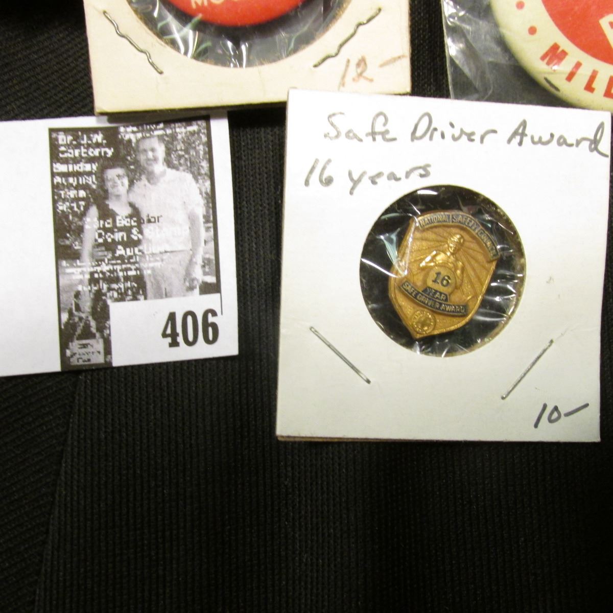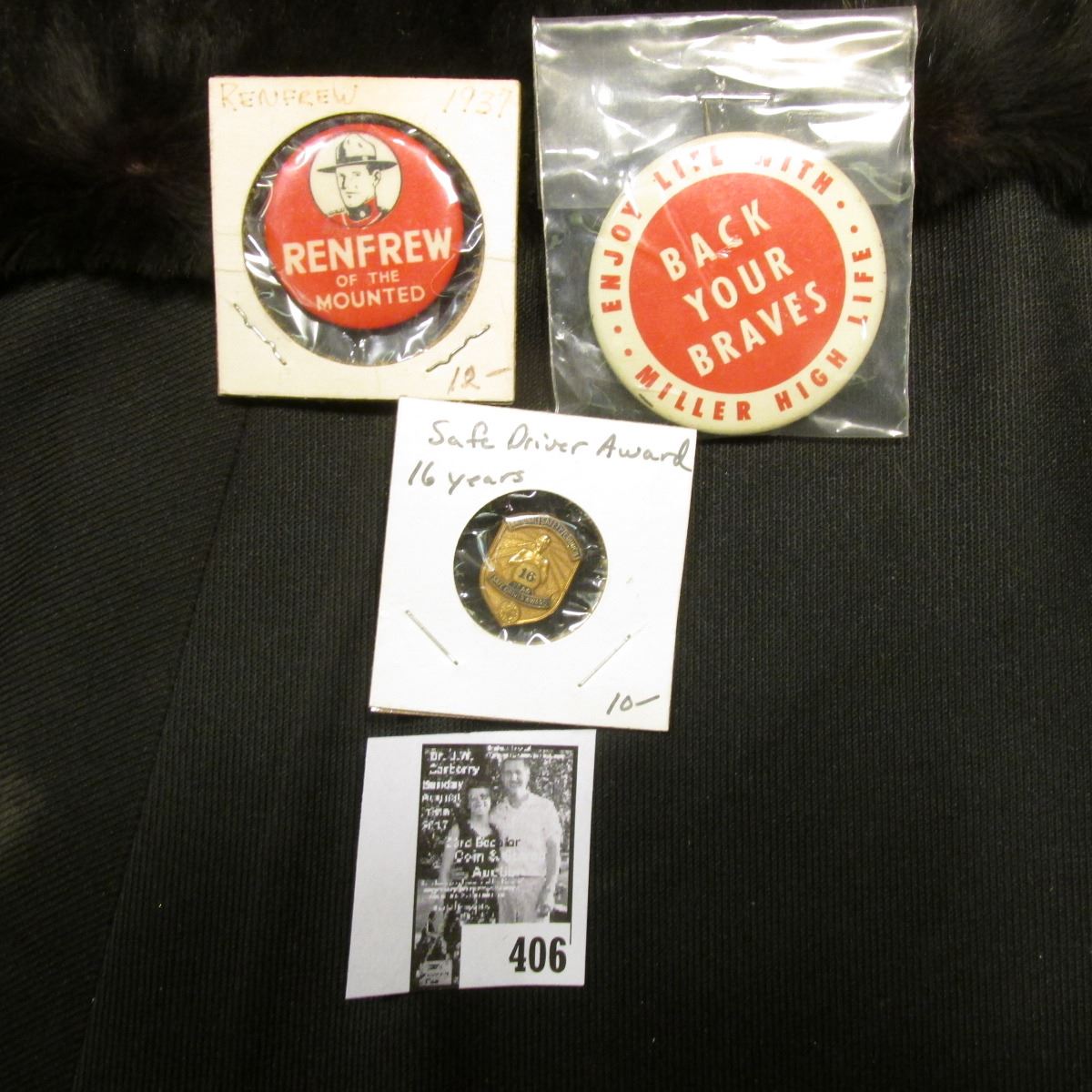 "Back Your Braves Enjoy Life With Miller High Life" Pin-back; "Renfrew/of the/Mounted" Pin-back; & "Safe Driver Award 16 Years" Gold-collored Pin-back.