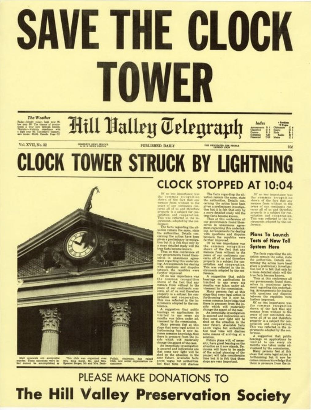 Marty McFly (Michael J. Fox) and Jennifer (Claudia Wells) received these flyers from the Hill Valley Preservation Society. This yellow and black printed flyer bears the header "Save the Clock Tower" and includes a photocopy of a Hill Valley Telegraph newspaper article titled" Clock Tower Struck by Lightning." The article recounts the events witnessed by McFly in 1955. Maintaining an excellent overall condition with minimal indications of wear from both production use and age. The dimensions of the flyer are 11" x 8.5" (28 cm x 21.5 cm). A Certificate of Authenticity from Studio Auctions accompanies the item.