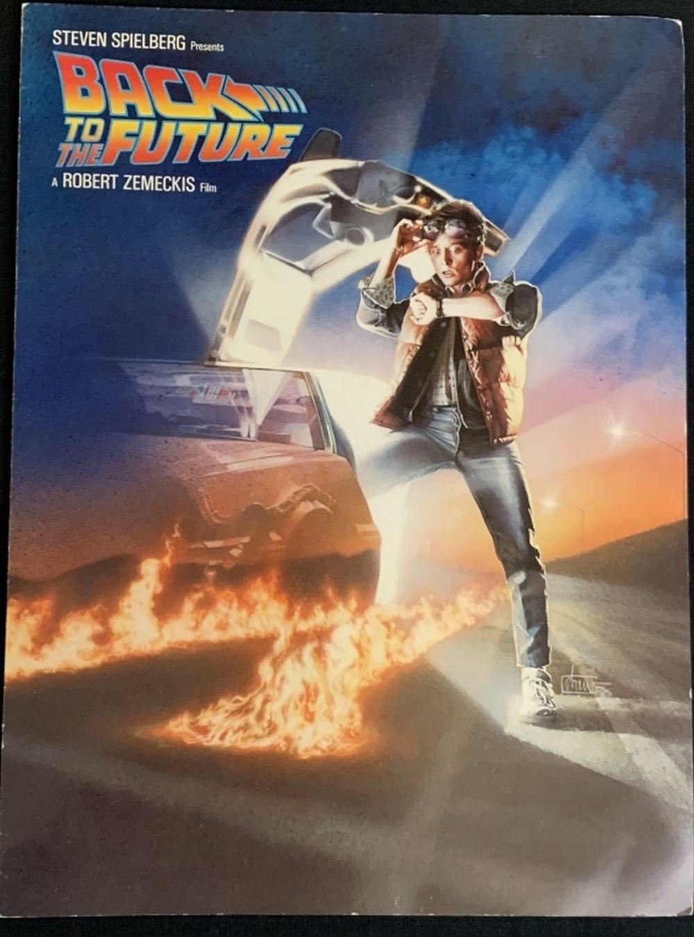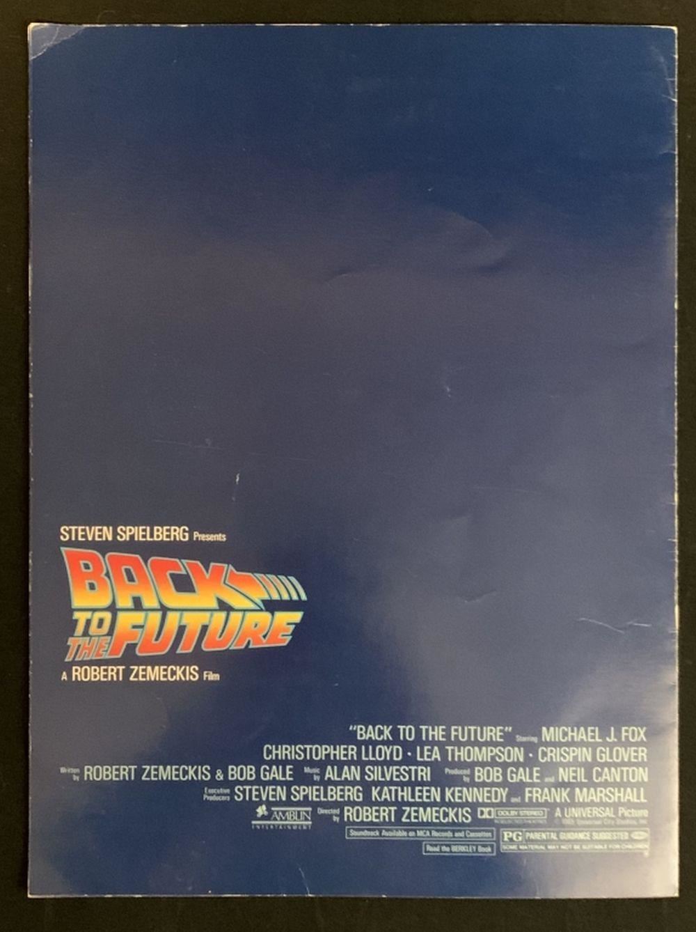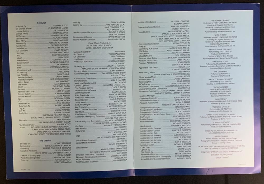 Original theater program given to a member of the editing crew at a special crew/cast screening made for the production of "Back to the Future" (1985), the Robert Zemeckis directed science fiction movie where, Marty McFly, a 17-year-old high school student, is accidentally sent thirty years into the past in a time-traveling DeLorean invented by his close friend, the eccentric scientist Doc Brow.