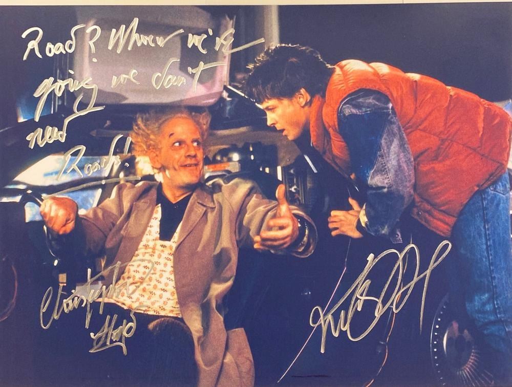 Back to the Future Christopher Lloyd and Michael J. Fox facsimile signed movie photo. 8x10 inches. This item is a reprint of an original autograph