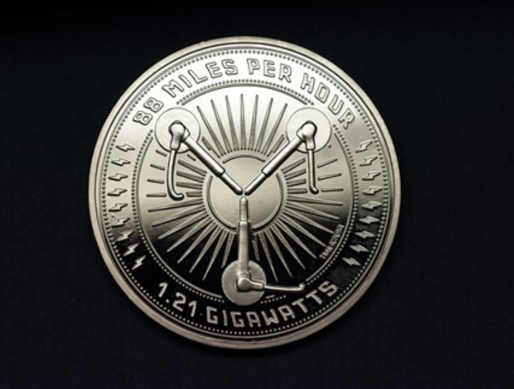 Save the Clock Tower!!! Limited to a production of only 9,995 coins worldwide, this silver edition individually-numbered coin measures 1.5 inches and is embossed on both sides. Front side reads "A Bolt of Lightning is Going to Strike the Clock Tower at Precisely 10:04 PM" and features the individual coin number. Back side reads "88 Miles Per Hour - 1.21 Gigawatts".