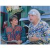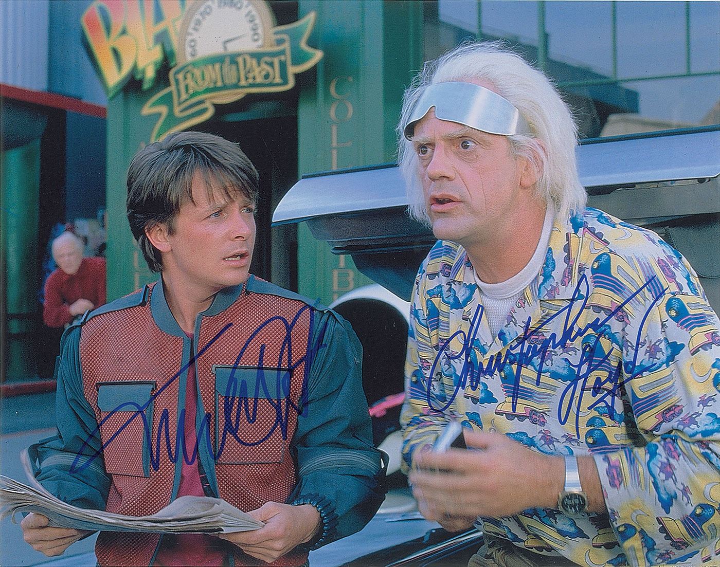 Color satin-finish 14 x 11 photo of Marty McFly and Dr. Emmett 'Doc' Brown from the 1989 film Back to the Future Part II, signed in blue felt tip by Michael J. Fox and Christopher Lloyd. In fine condition, with mild corner tip dings. Originally obtained by in-person specialist Mike Wehrmann.