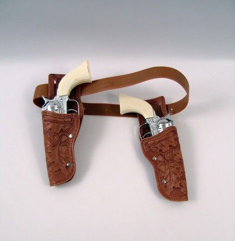 What are the 1950's without a child's cowboy guns and holsters? These are a set of 50's style plastic gun holsters with toy pistols used in "Back to the Future" (1985), in the "back to the past" Hill Valley sequences.