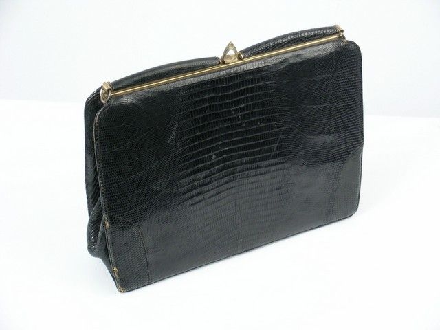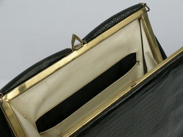 Black hand bag with gold clasp at the top, used by an extra in the film "Back to the Future". Approx. 10" x 8.5" x 3.5"