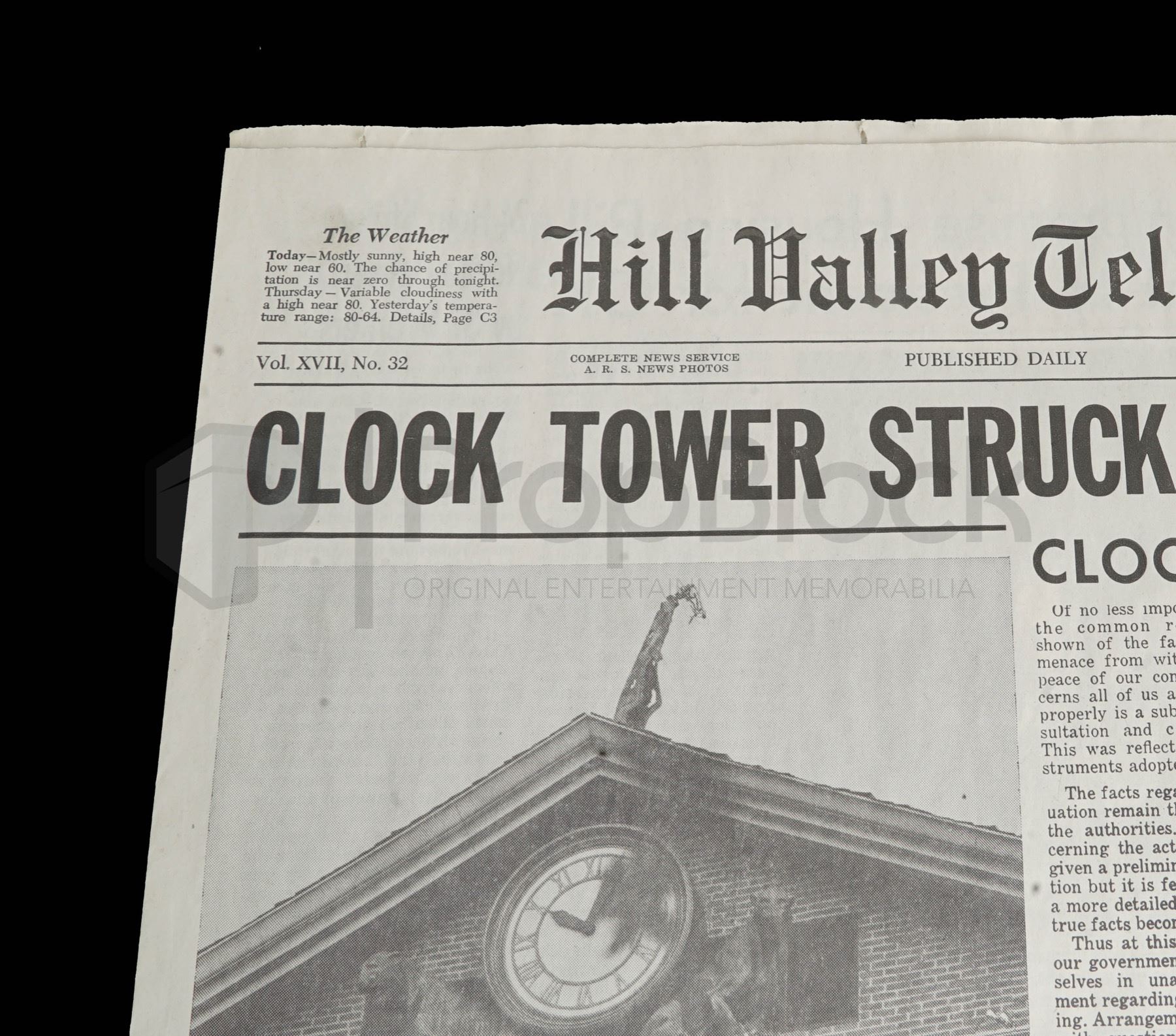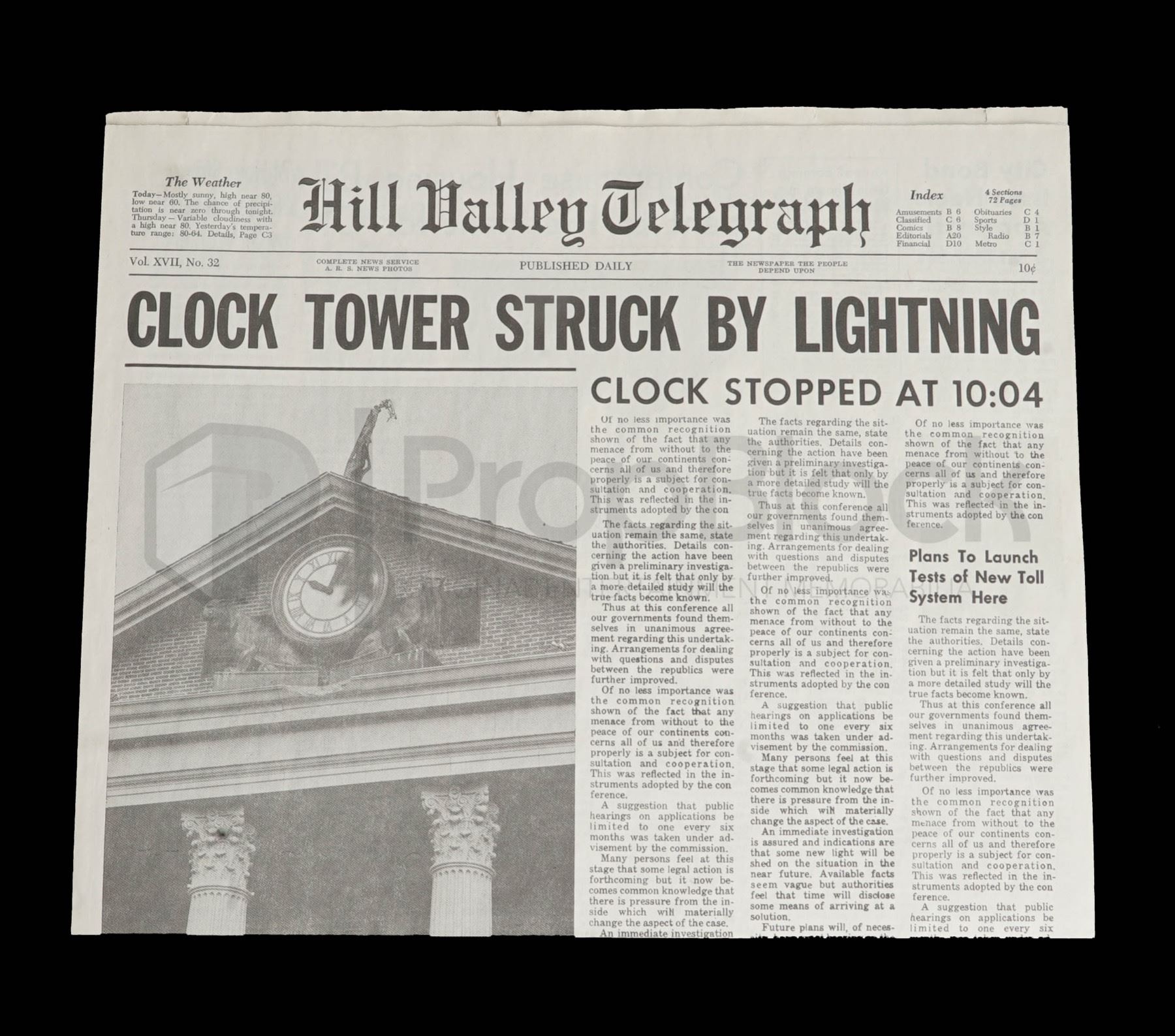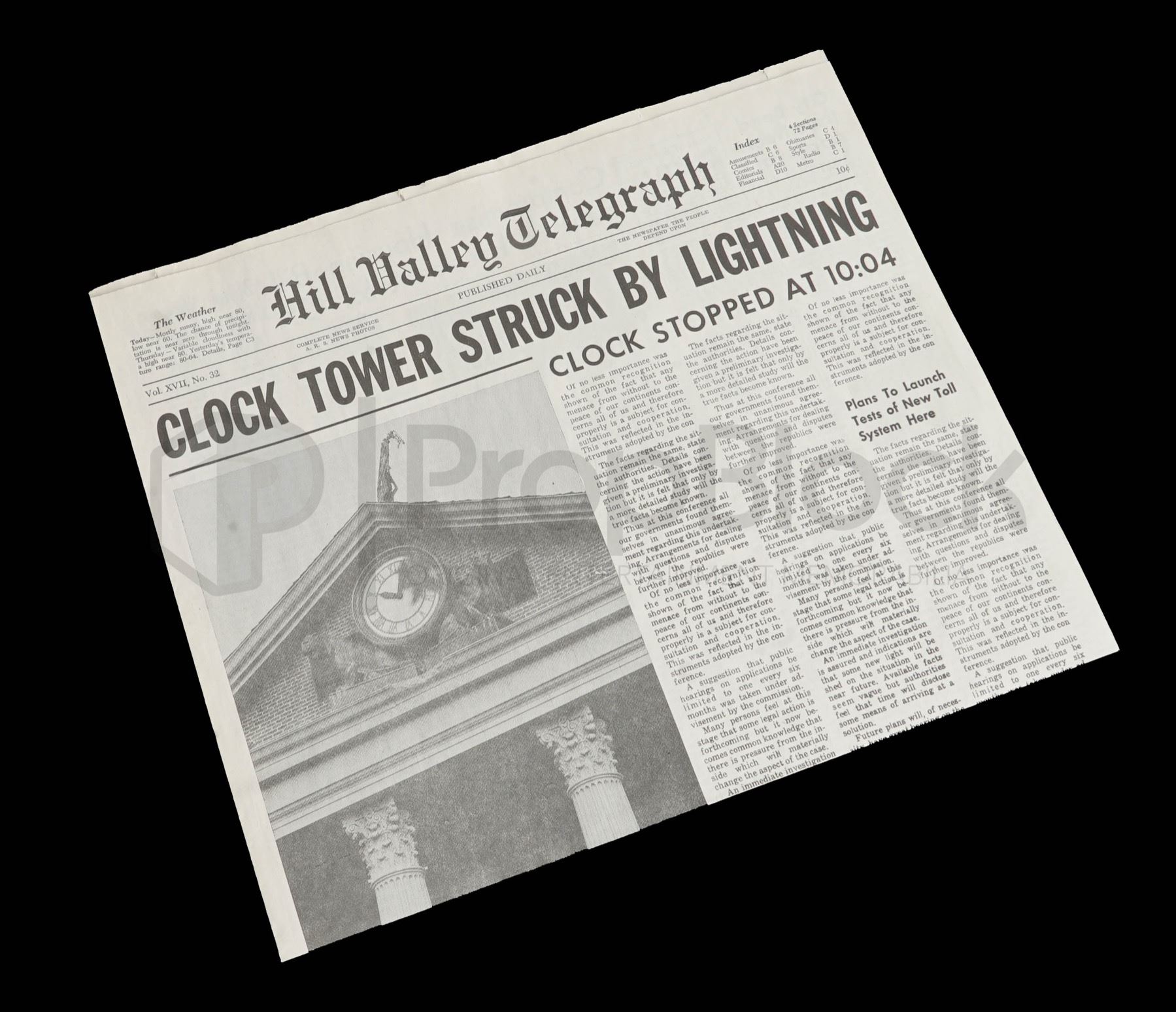 Production made "Hill-Valley Telegraph" made for use in the science fiction film Back to the Future. After visiting 2015, Marty McFly must repeat his visit to 1955 to prevent disastrous changes to 1985...without interfering with his first trip. This is a custom printed prop on newsprint, featuring the header "Clock tower struck by lightning". This is a full newspaper, folded with black ink. This piece was made by the production but unknown if used on screen. It remains in excellent, production made condition.