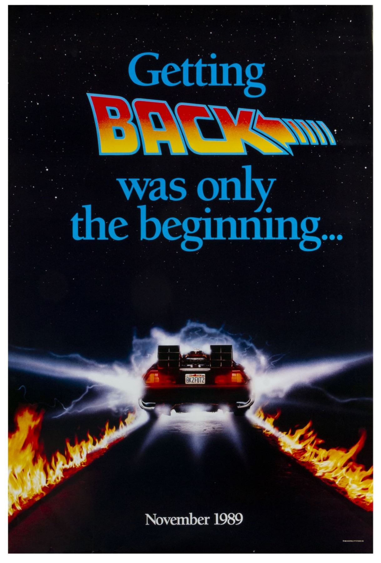 (Universal, 1989) An original advance one sheet poster promoting the upcoming theatrical release of "Back to the Future Part II". This poster comes from the collection of Bill Wallen, who helped create promotional and advertising campaigns for the film, and has never been folded, restored, or altered. Featuring a great image of the DeLorean with the license plate number "BK2FUT2", this poster measures 39.75"x26.75". The condition is good to very good, with minor creasing throughout including some wear to the right-edge, and some small scuffs along bottom-edge.