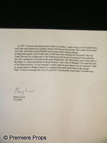 From one of the most beloved film anthologies ever produced, this is a prop Pepsi bottle from the Robert Zemeckis 1989 Sci-fi film 'Back to the Future - Part II.' After traveling to the year 2015, Marty McFly (Michael J. Fox) attempts to dissuade his other self from taking part in a robbery and ventures into a futuristic diner where he orders a Pepsi Perfect, which miraculously pops up from the middle of a table. The bottle is made from hard plastic resin which is colored to resemble the soda, with a non-removable blue plastic lid. The bottle has a small hole drilled into the base, where it would have been fastened to the table for its push to the surface. One of the more memorable props from the film, it comes with a letter of authenticity stating the provenance in receiving the piece. (measures approx. 8 1/2" tall).