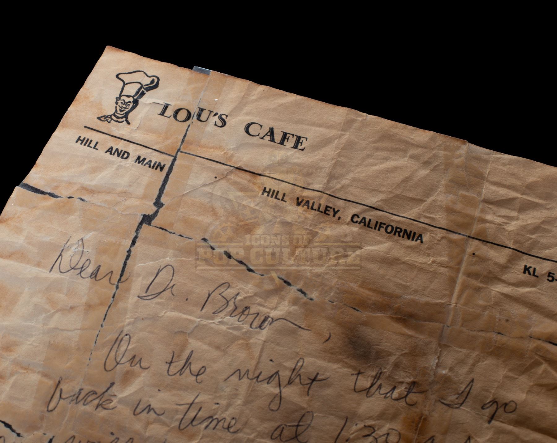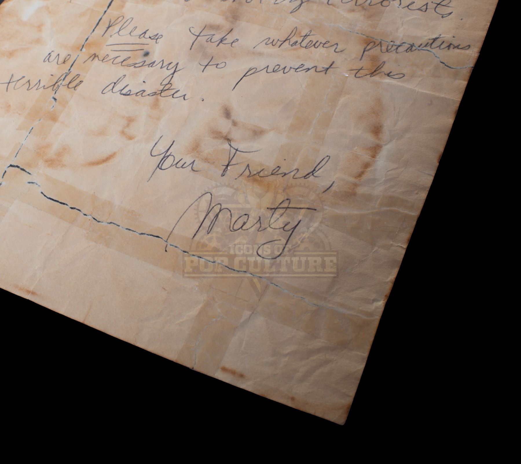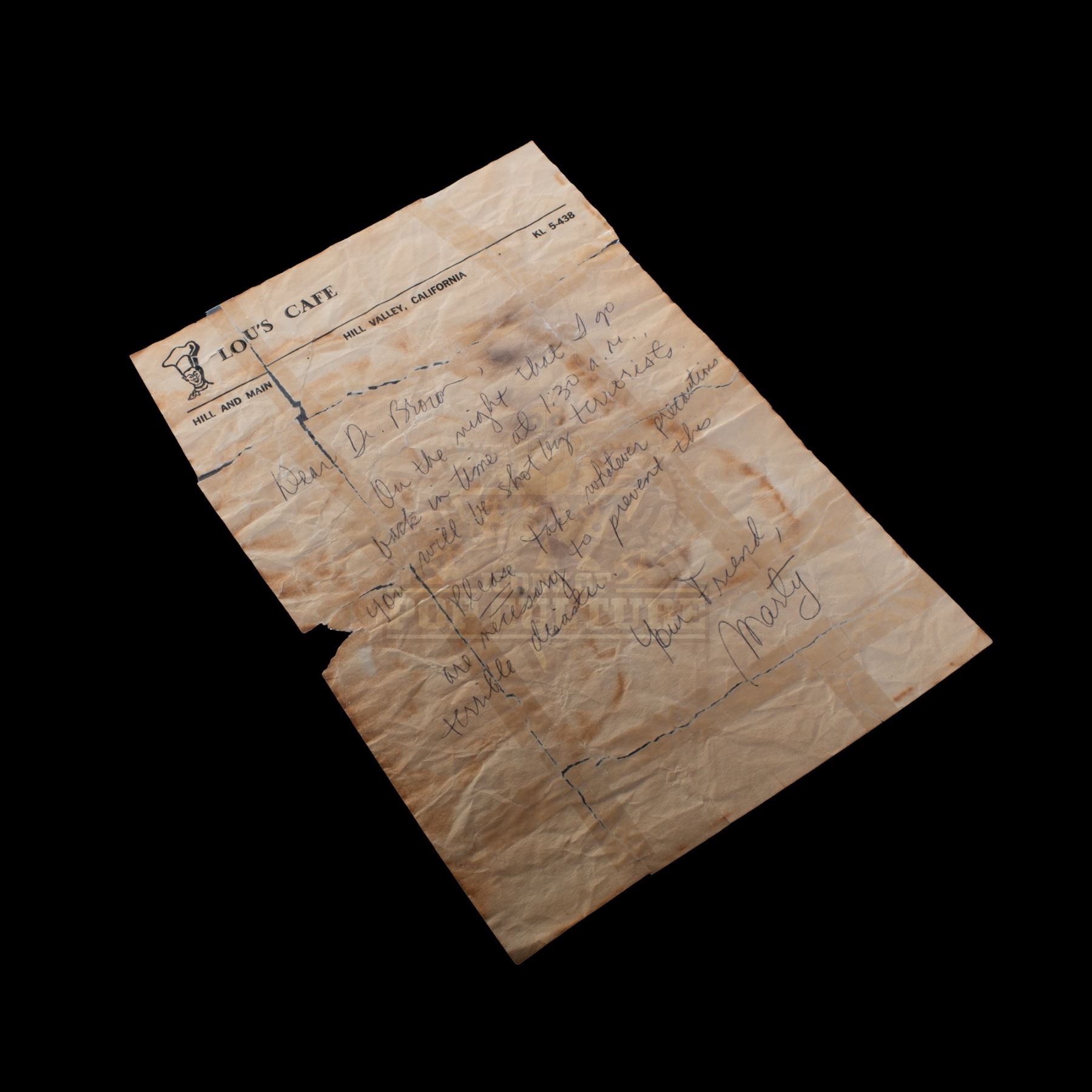 This prop distressed letter was custom-made by the ride’s production team for use as set dressing in the waiting room. The letter, on Lou’s Café letterhead is distressed and torn and repaired with tape. The letter features Marty’s warning to Doc about the terrorists. An interesting prop from the classic Universal Studios Theme Part Attraction. Measures 10.25” x 7”.