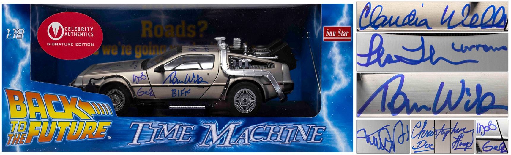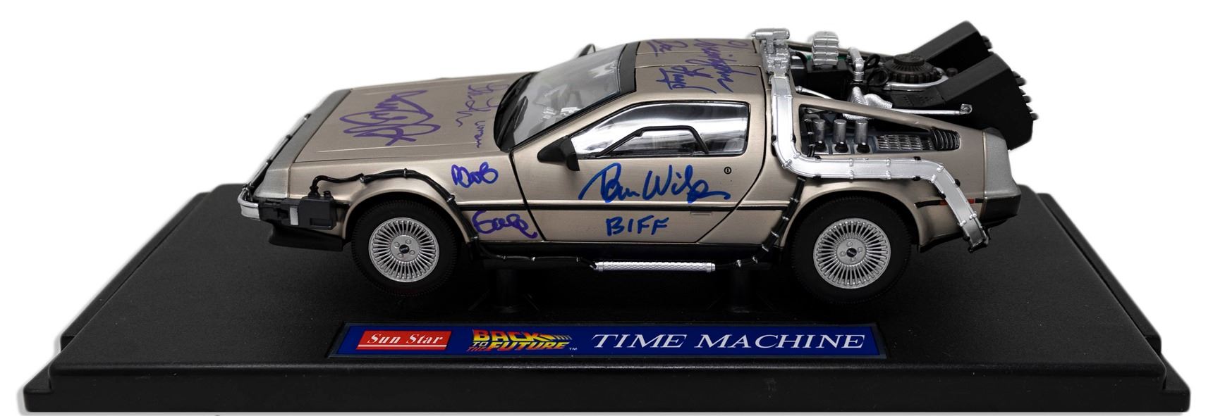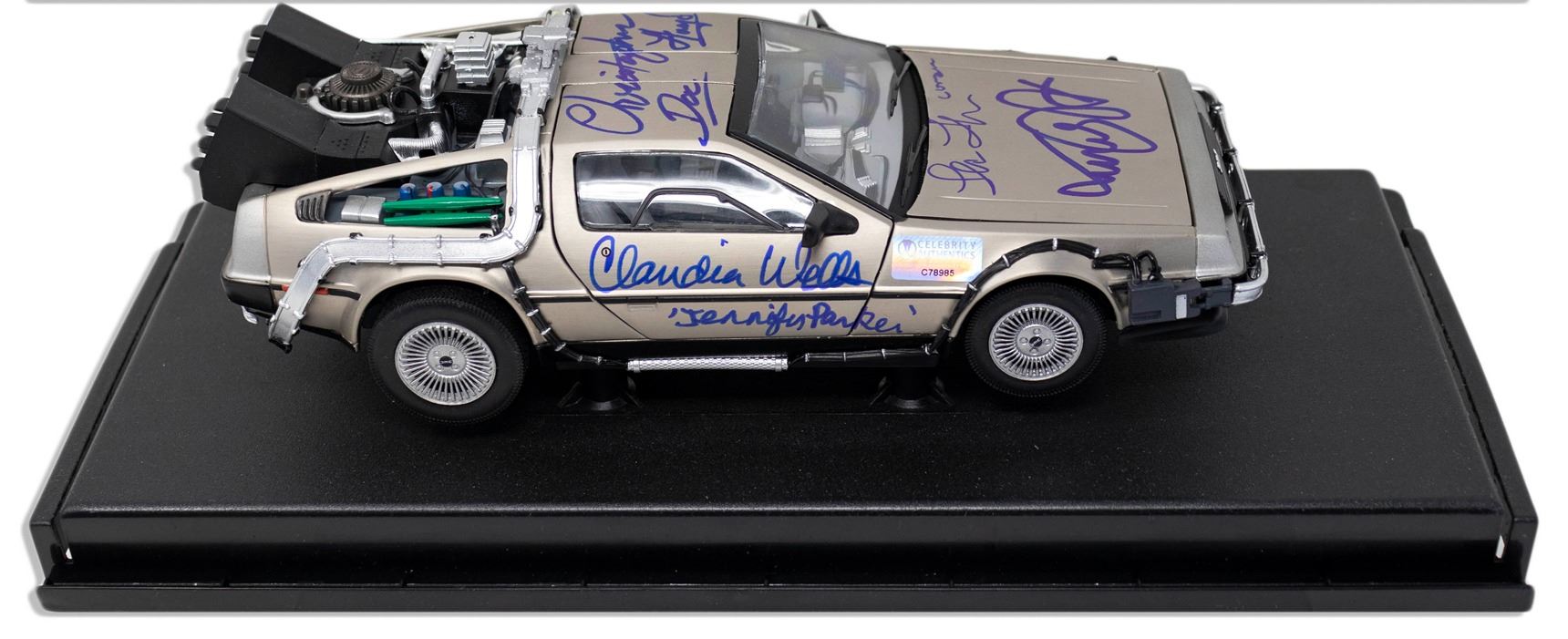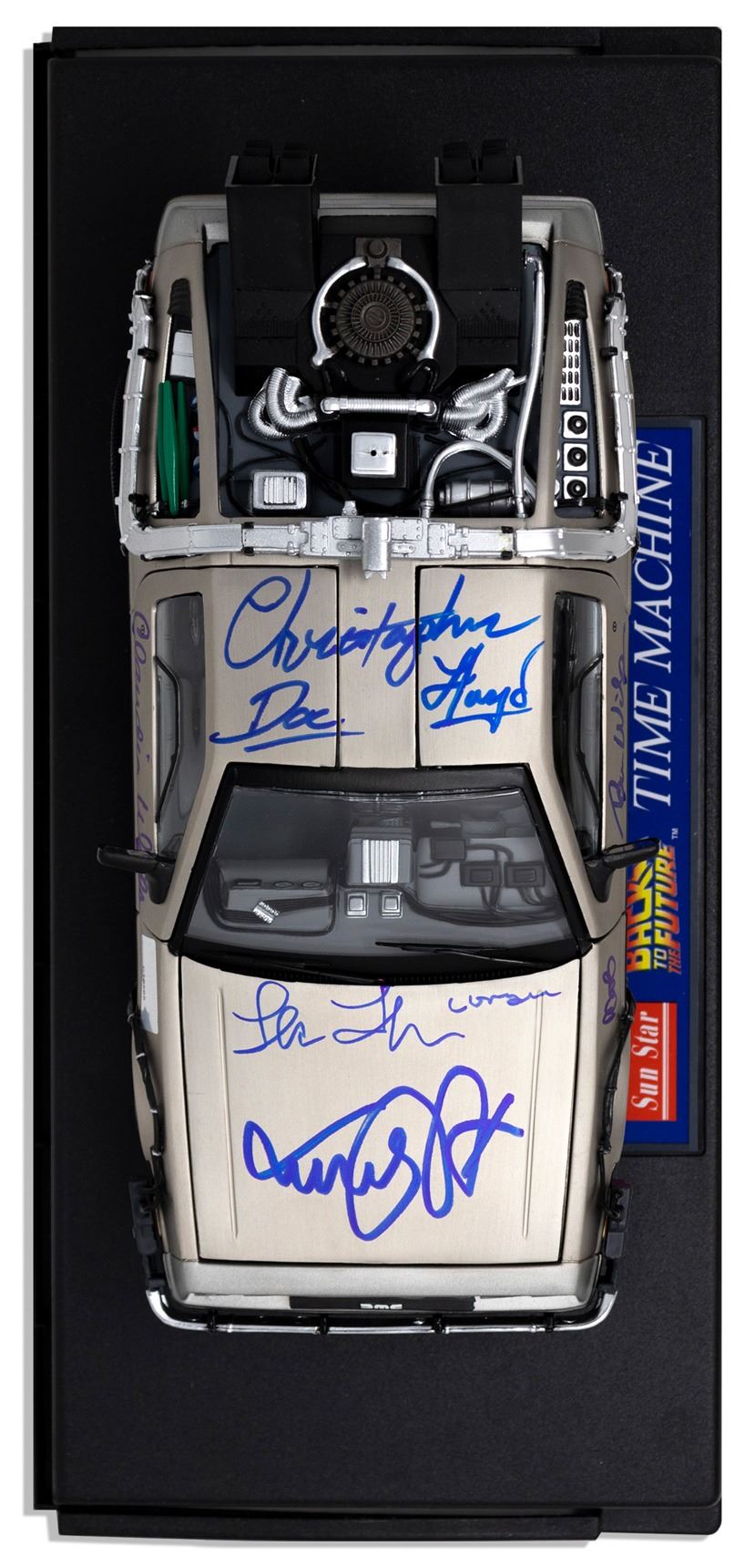 324. Back to the Future cast signed DeLorean model. (Universal, 1985) Original miniature DeLorean DMC-12 model car, a replica of the famous time traveling machine signed in blue ink by cast members Michael J. Fox, Christopher Lloyd, Thomas Wilson, Lea Thompson, Claudia Wells, and screenwriter Bob Gale. Car is 1:18 scale die-cast of the original, measuring 9.75 x 4.5 x 3.75 in. In fine condition, and in original box. Accompanied by COAs for each signature from Celebrity Authentics. $500 - $700