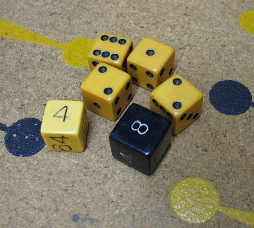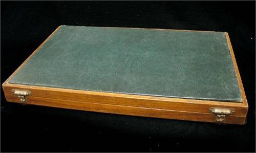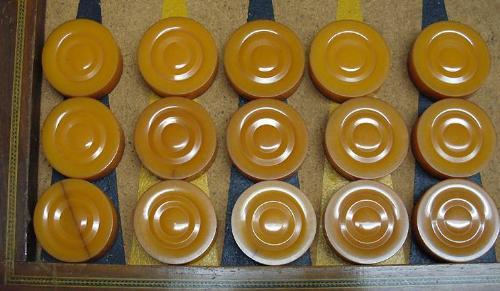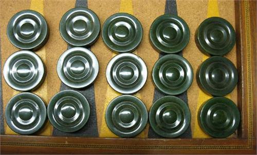Backgammon game; folding hinged mahogany game board with exterior green leather panels; painted cork board surrounded by inlaid banding; fifteen butterscotch (two with cracks) and fifteen dark green bakelite game pieces 1/2" x 1 3/4" diameter; folded game board measures 23 1/2" x 15"; early to mid 20th C.