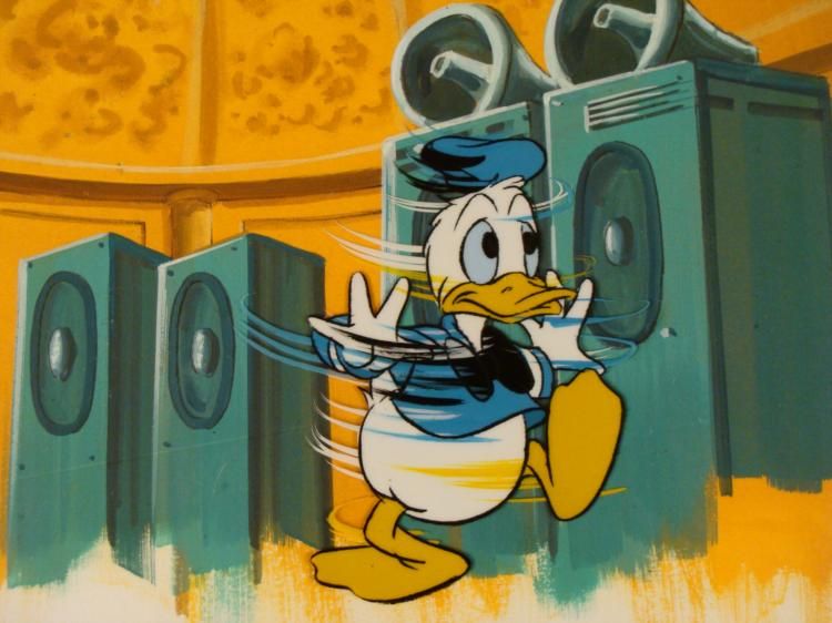 Donald Duck is a cartoon character created in 1934 at Walt Disney Productions. Donald is an anthropomorphic white duck with a yellow-orange bill, legs, and feet. He typically wears a sailor suit with a cap and a black or red bow tie. Donald is most famous * for his semi-intelligible speech and his mischievous and irritable personality. Along with his friend Mickey Mouse, Donald is one of the most popular Disney characters and was included in TV Guide's list of the 50 greatest cartoon characters of all time in * 2002 * * * * WOW, what is going on?!?!? * * * * The background that accompanies this cel doesn't correspond to the episode the cel is from. * * * Original Production Background and Animated Cel * Overall Size of Background: 10 1/2" x 13 1/4"Overall Size of the Cel: 10 1/2" x 12 1/2" * Excellent Condition * * * This is an original hand-painted cel set-up used in the production of an episode of "Donald Duck." Each one-of-a-kind set-up represents a slight change in position of the characters. When individually photographed and projected in rapid succession, the images * appear to move. * * To create production cels, the original animator's drawing is transferred onto an acetate cel (by hand-inking and/or photo copying). The cel is then hand-painted on the reverse side. The background accompanying this set-up is a hand-painted original production * background. * * The background and cel are ready to be matted and framed. It is a colored background with a cel that has the animator's notations at the bottom of both. * * * *