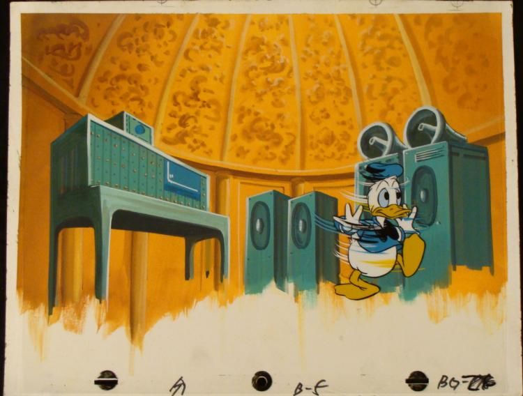 Donald Duck is a cartoon character created in 1934 at Walt Disney Productions. Donald is an anthropomorphic white duck with a yellow-orange bill, legs, and feet. He typically wears a sailor suit with a cap and a black or red bow tie. Donald is most famous * for his semi-intelligible speech and his mischievous and irritable personality. Along with his friend Mickey Mouse, Donald is one of the most popular Disney characters and was included in TV Guide's list of the 50 greatest cartoon characters of all time in * 2002 * * * * WOW, what is going on?!?!? * * * * The background that accompanies this cel doesn't correspond to the episode the cel is from. * * * Original Production Background and Animated Cel * Overall Size of Background: 10 1/2" x 13 1/4"Overall Size of the Cel: 10 1/2" x 12 1/2" * Excellent Condition * * * This is an original hand-painted cel set-up used in the production of an episode of "Donald Duck." Each one-of-a-kind set-up represents a slight change in position of the characters. When individually photographed and projected in rapid succession, the images * appear to move. * * To create production cels, the original animator's drawing is transferred onto an acetate cel (by hand-inking and/or photo copying). The cel is then hand-painted on the reverse side. The background accompanying this set-up is a hand-painted original production * background. * * The background and cel are ready to be matted and framed. It is a colored background with a cel that has the animator's notations at the bottom of both. * * * *