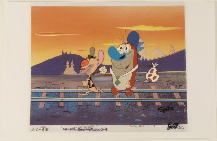 To create production cels, the original animator's drawing is transferred onto an acetate cel (by hand-inking and/or photo copying). The cel is then hand-painted on the reverse side. The background accompanying this set-up is a color reproduction of an original production background.The cel is ready to be matted and framed. The animator's notations are shown at the bottom of the background and the bottom of the cel. There is a Spike TV logo on the bottom right corner of the cel. There is some slight paint fade to Ren and Stimpy's outlines.