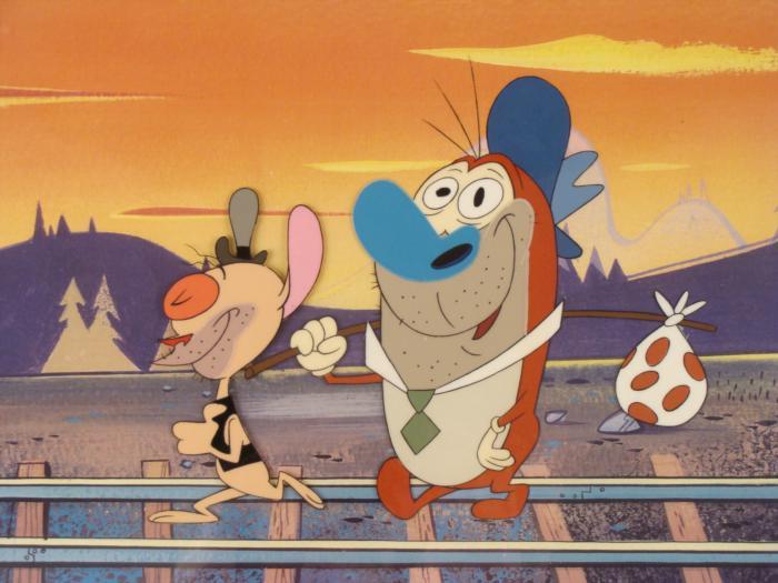 This is an original production animation cel from the Nickelodeon TV show Ren & Stimpy. The show follows two characters - Ren, a crazy Chihuahua - and - Stimpy, an incredibly stupid cat - as they think up to all kinds of hair brained schemes and get themselves into some sticky situations. The Ren and Stimpy Show debuted in August 1991 with a two-part episode, 'Stimpy's Big Day / The Big Shot' and became an instant hit. It was the third Nicktoon ever to be aired on the Network alongside Doug and Rugrats. Ren and Stimpy are hobos here.Original Production Art Cel Cel Overall Size of the Cel: 10 1/2" x 12 1/2" Overall Size of the Background: 11" x 17" Excellent condition This is an original hand-painted cel set-up used in the production of an episode of "The Ren & Stimpy Show." Each one-of-a-kind set-up represents a slight change in position of the characters. When individually photographed and projected in rapid succession, the images appear to move.