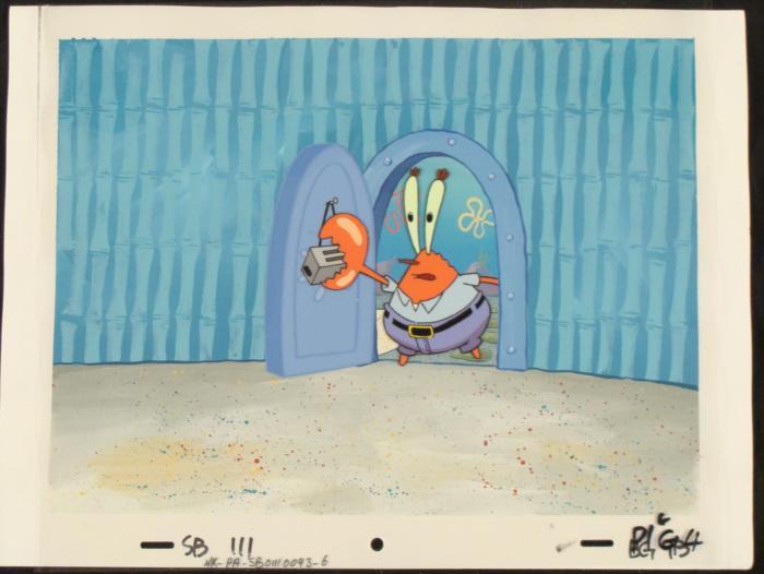 To create production cels, the original animator's drawing is transferred onto an acetate cel (by hand-inking and/or photo copying). The cel is then hand-painted on the reverse side. The background accompanying this set-up is a hand-painted original production background. The background is ready to be matted and framed. It is a colored background with a cel and has the animator's notations at the bottom of the background and the cel. The cel has multiple layers; first is the door and the second cel is Mr. Krabs.
