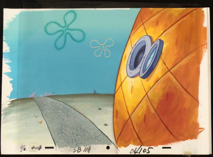 This original hand-painted background and animation cel are from the Nickelodeon TV show SpongeBob Squarepants. The story takes place under the deep blue sea in Bikini Bottom, where SpongeBob resides. SpongeBob, who is a yellow, porous sponge, is your typical happy-go-lucky character, as he is always cheerful and enjoys making people laugh. Patrick Star, SpongeBob's neighbor who is a starfish, is your average children's show idiot, as he boasts knowing nothing and is often getting himself into ridiculous situations. Between the homes of these two lies the home of the miserable Squidward, a squid, who is known for being grouchy and playing tricks on SpongeBob and Patrick. Both SpongeBob and Squidward work at the Krusty Krab, a fast food business run by the greedy money-loving Mr. Krabs, a crab, the arch rival of the evil, possibly misunderstood, Plankton. Another neighbor, Sandy Cheeks, an athletic squirrel who normally wears an astronaut's space suit, was introduced in "Tea at the Treedome." She spends most of her time inventing and experimenting. It is SpongeBob's home.Original Production Background and Animated Cel Overall Size of Background: 10 1/2" x 14 1/4" Overall Size of the Cel: 10 1/2" x 12 1/2" Very good condition This is an original hand-painted cel set-up used in the production of an episode of "SpongeBob SquarePants." Each one-of-a-kind set-up represents a slight change in position of the characters. When individually photographed and projected in rapid succession, the images appear to move.