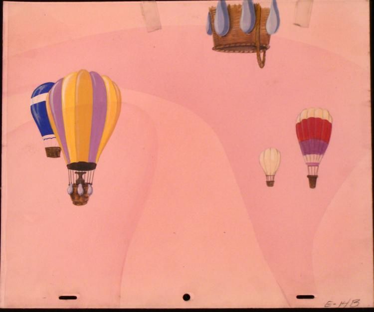Up, up, and away... * Original Animation BackgroundSize: 10 1/2" x 12 1/2" * Condition: Very good; some smudge marks throughout * Original Animation Backgrounds are used in the making of the final version * of animated productions. The background establishes the location and the * overall good mood of the scene. Typically, a background layout artist * creates a drawing to establish the content of the scene, placement of * characters, perspective and camera angle. Based on this drawing, the * background artist creates a preliminary painting to confirm all of the scenes * details, then the final production background which is used in the filming of * the scene. When these backgrounds are individually photographed behind * the progression of production cels, and projected at a rapid succession, the * images in the foreground appear to move, creating an animated scene. * * The background is ready to be matted and framed with the animator's notations located at the bottom. *