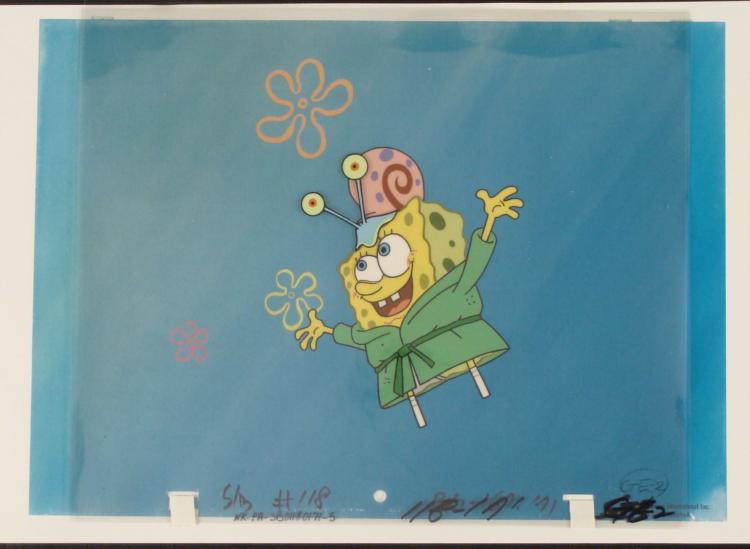 This animation cel and reproduction background are from the Nickelodeon TV show SpongeBob Squarepants. The story takes place under the deep blue sea in Bikini Bottom, where SpongeBob resides. SpongeBob, who is a yellow, porous sponge, is your typical happy-go-lucky character, as he is always cheerful and enjoys making people laugh. Patrick Star, SpongeBob's neighbor who is a starfish, is your average children's show idiot, as he boasts knowing nothing and is often getting himself into ridiculous situations. Between the homes of these two lies the home of the miserable Squidward, a squid, who is known for being grouchy and playing tricks on SpongeBob and Patrick. Both SpongeBob and Squidward work at the Krusty Krab, a fast food business run by the greedy money-loving Mr. Krabs, a crab, the arch rival of the evil, possibly misunderstood, Plankton. Another neighbor, Sandy Cheeks, an athletic squirrel who normally wears an astronaut's space suit, was introduced in "Tea at the Treedome." She spends most of her time inventing and experimenting. * Hey Gary, check out this balancing act... Tada!! * Original Printed Background and Animated Cel Overall Size of Background: 11" x 17" Overall Size of the Cel: 10 1/2" x 12 1/2" Excellent condition This is an original hand-painted cel set-up used in the production of an episode of "SpongeBob SquarePants." Each one-of-a-kind set-up represents a slight change in position of the characters. When individually photographed and projected in rapid succession, the images appear to move. * To create production cels, the original animator's drawing is transferred onto an acetate cel (by hand-inking and/or photo copying). The cel is then hand-painted on the reverse side. The background accompanying this set-up is a reproduction background. * The printed background and cel are ready to be matted and framed. The notations are located at the bottom of both. The cel is multi-layered, first is half of Gary's body, next is Spongebob's eyes, and then the main image. *